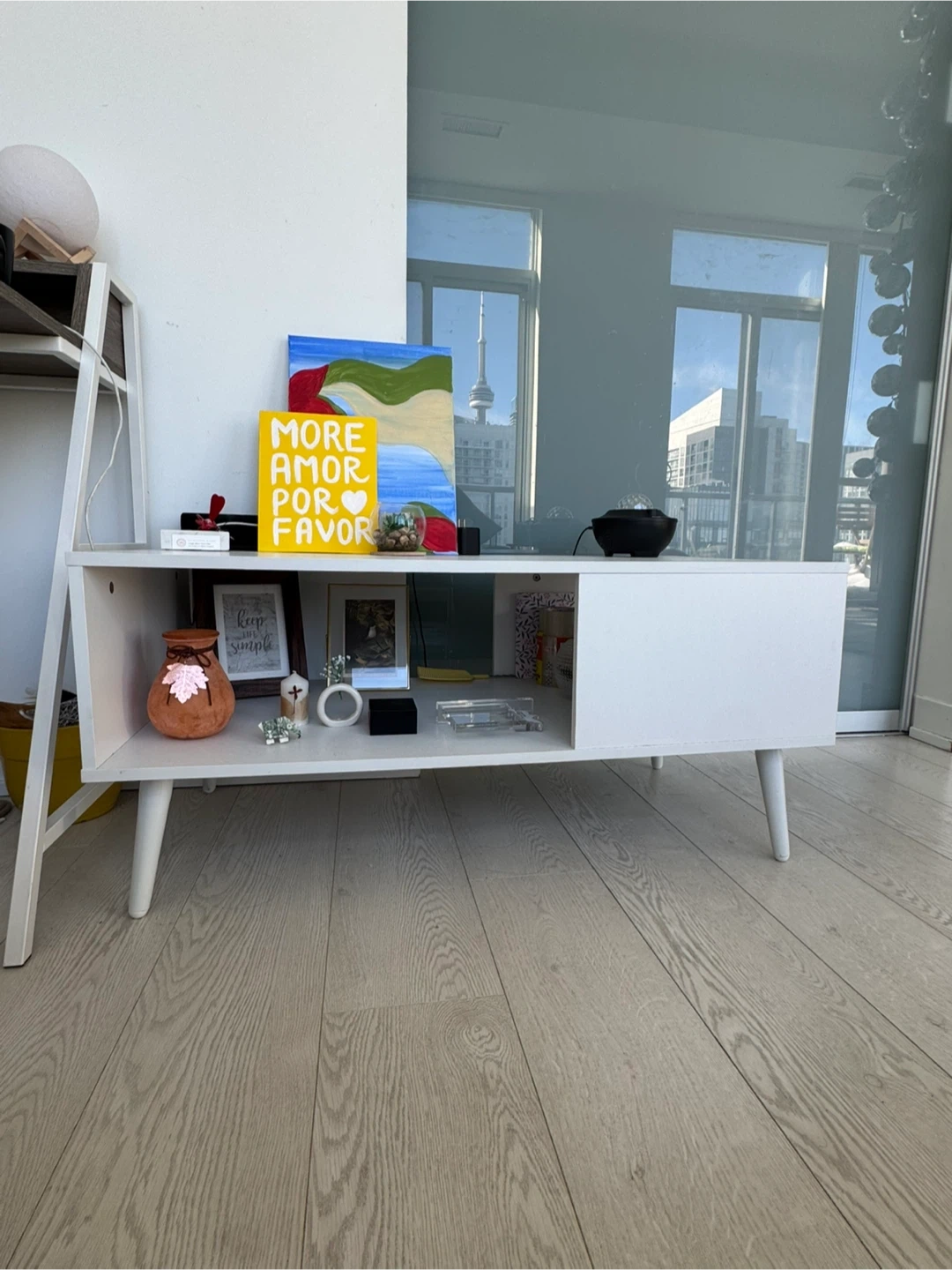 Selling a modern white TV table that can also be used as a coffee table, console table, or low storage unit.