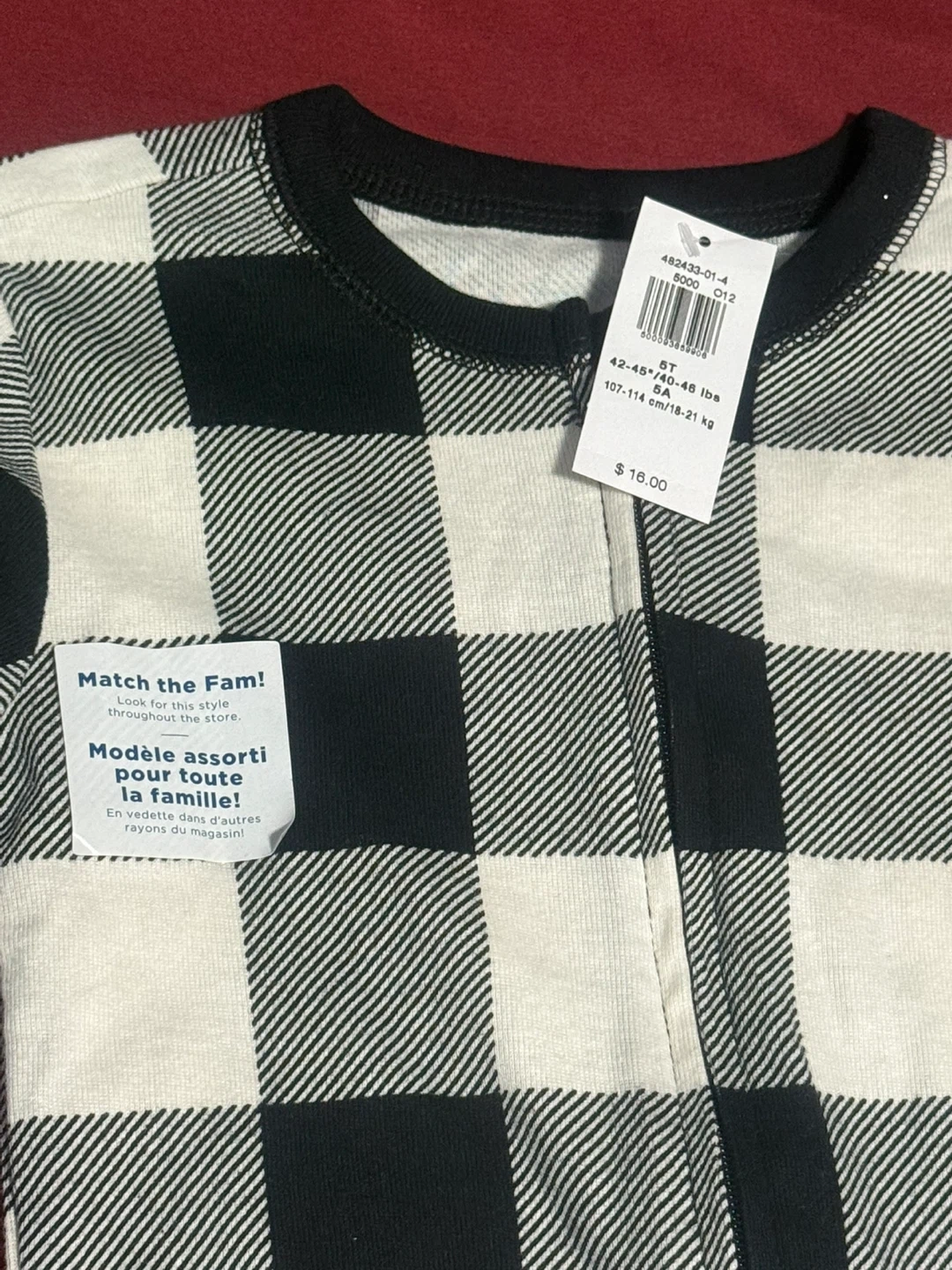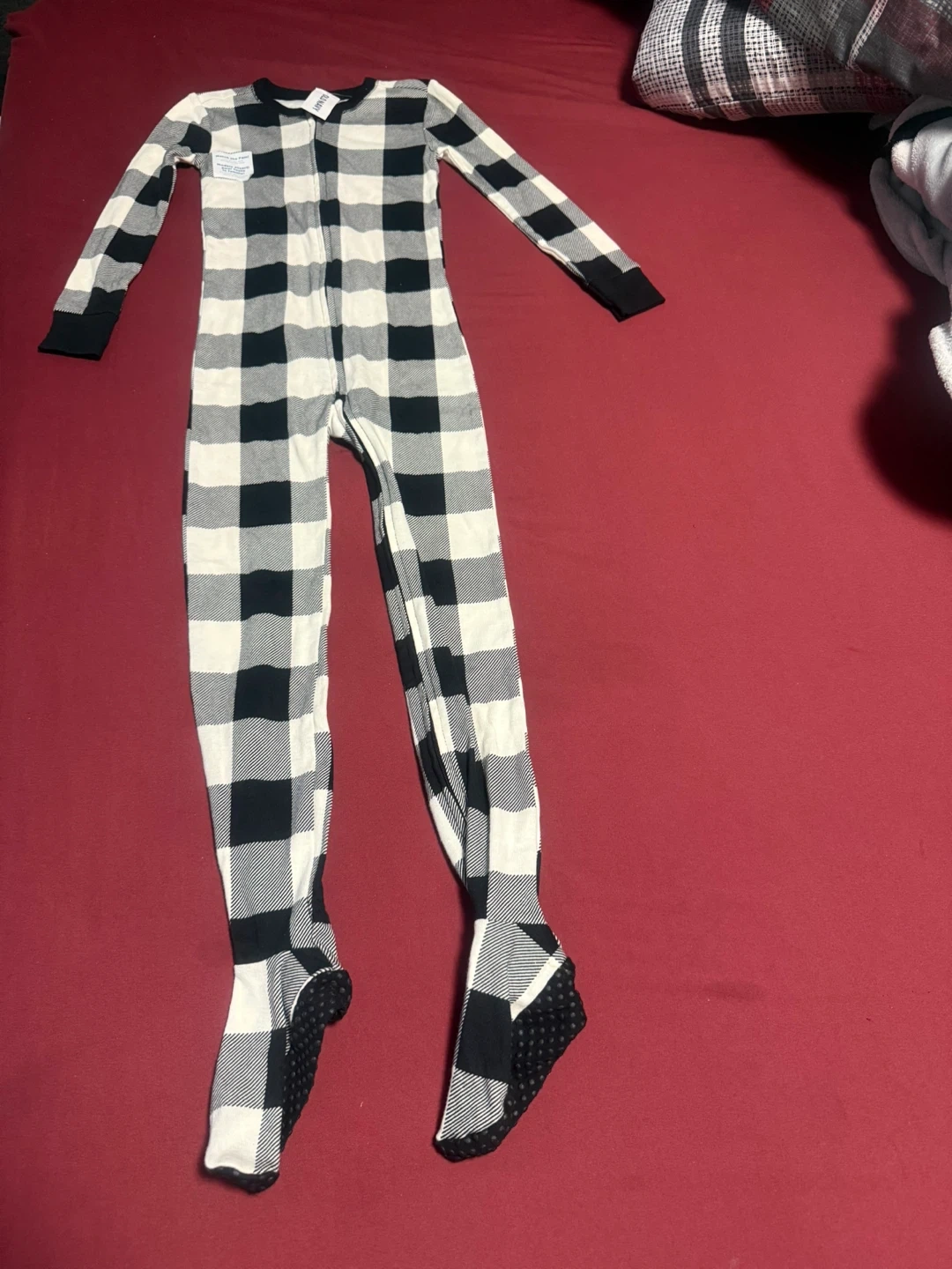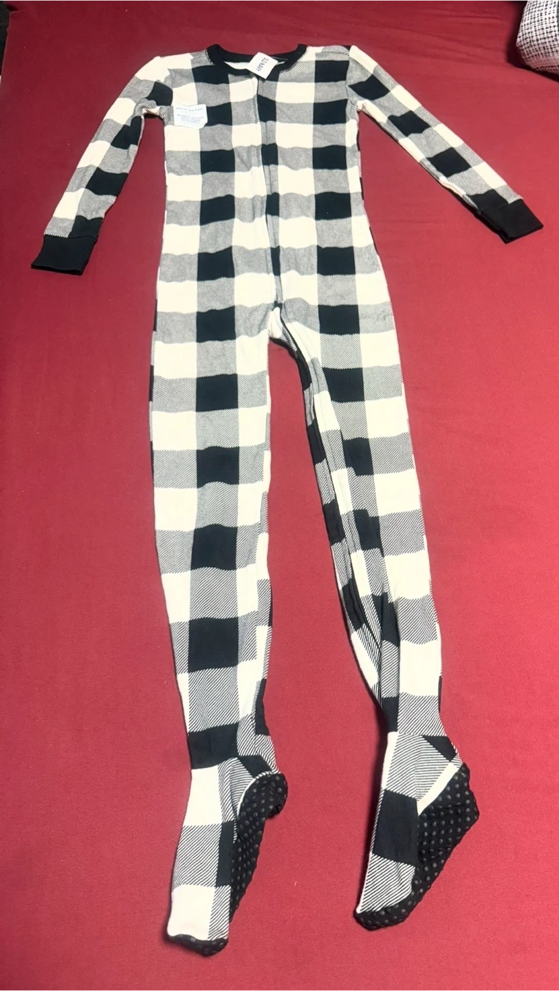 These Carter's footed pajamas come in a classic black and white buffalo check pattern. They're a size 5T and feature non-slip grippers on the feet. Perfect for cozy nights!