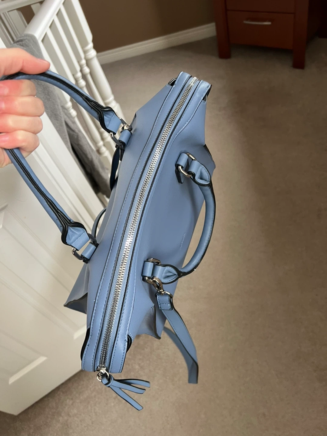 This is a chic Mia & Luca handbag in a lovely blue hue. It features a zip-top closure and an optional shoulder strap. This bag is made from a smooth, durable material.