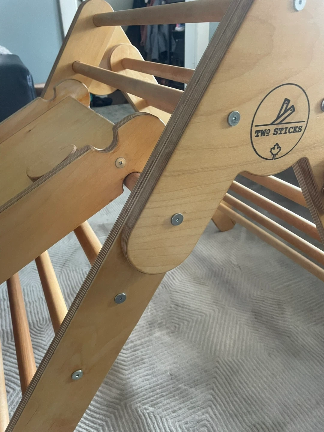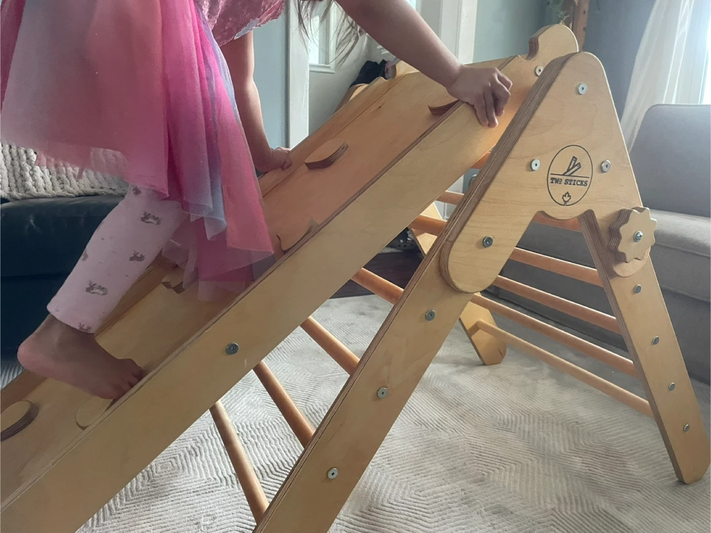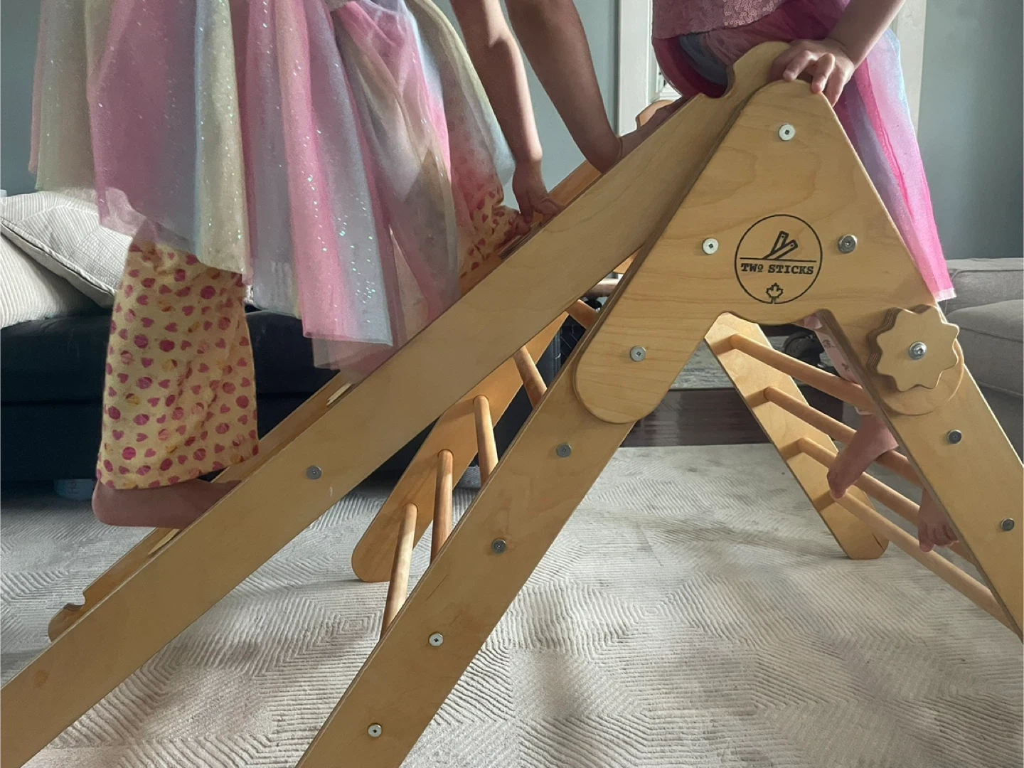 A Two Sticks wooden climbing triangle and ramp set made from natural wood. This climbing structure is great for developing gross motor skills. It folds for easier storage. Includes adjustable knobs and climbing holds.