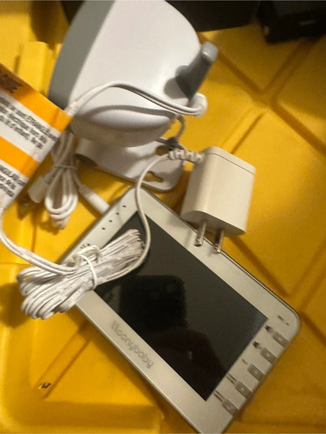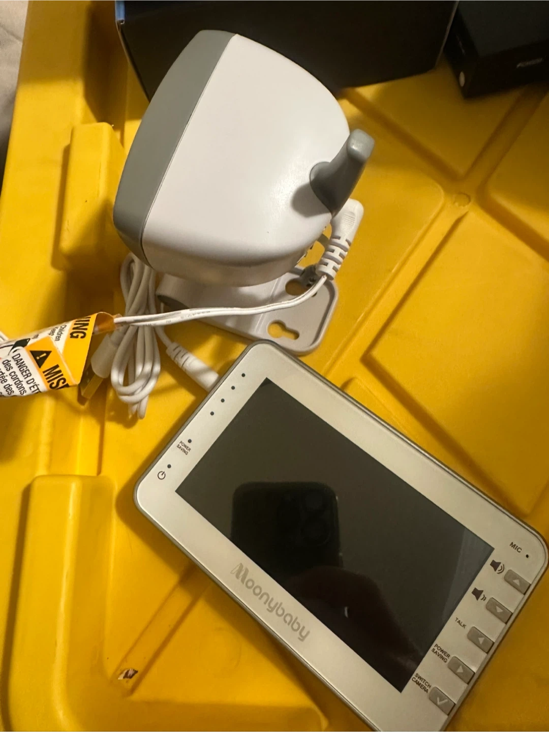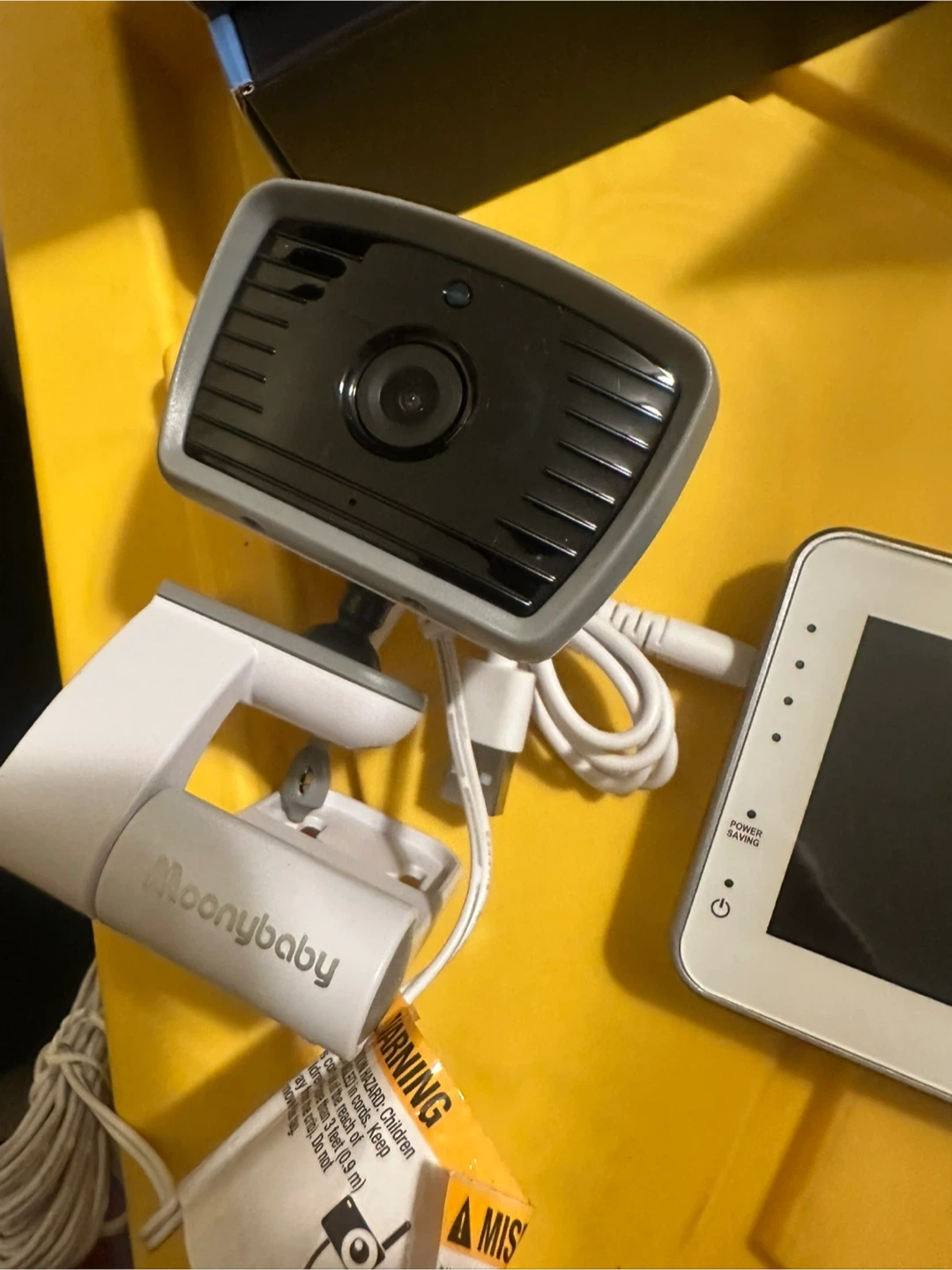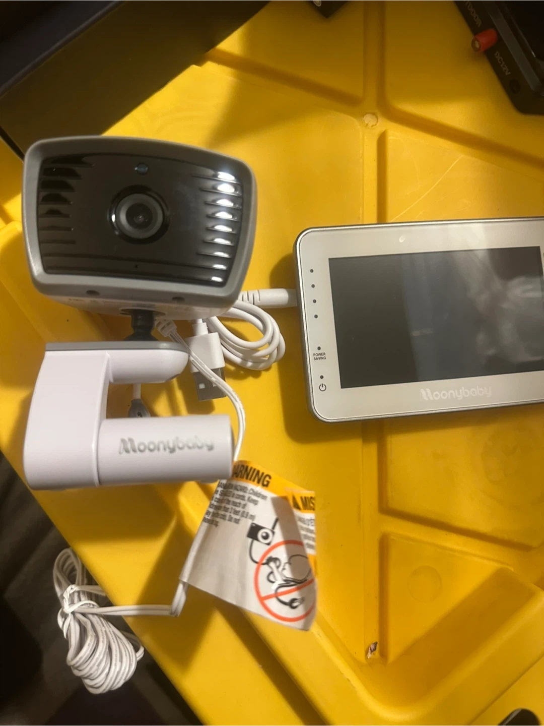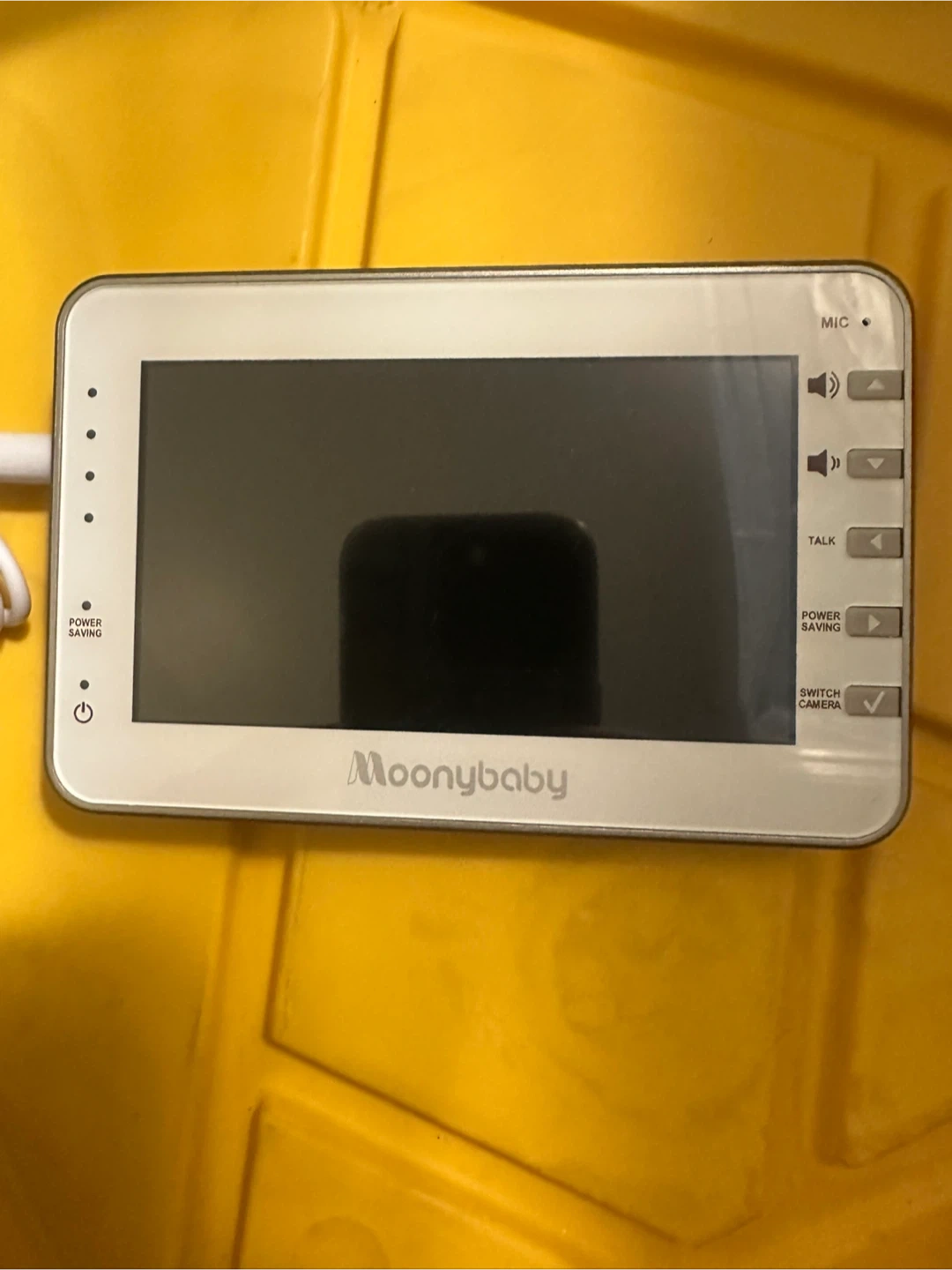 This is a Moonybaby video baby monitor. It includes a parent unit with a screen and a baby unit with a camera. The parent unit has buttons for power saving, talk, and switching cameras.