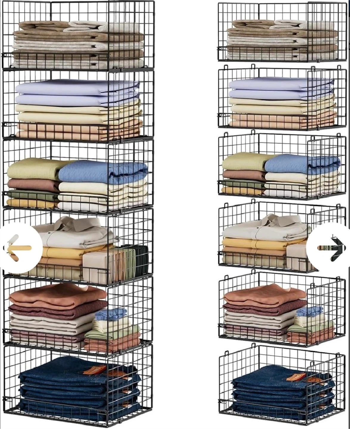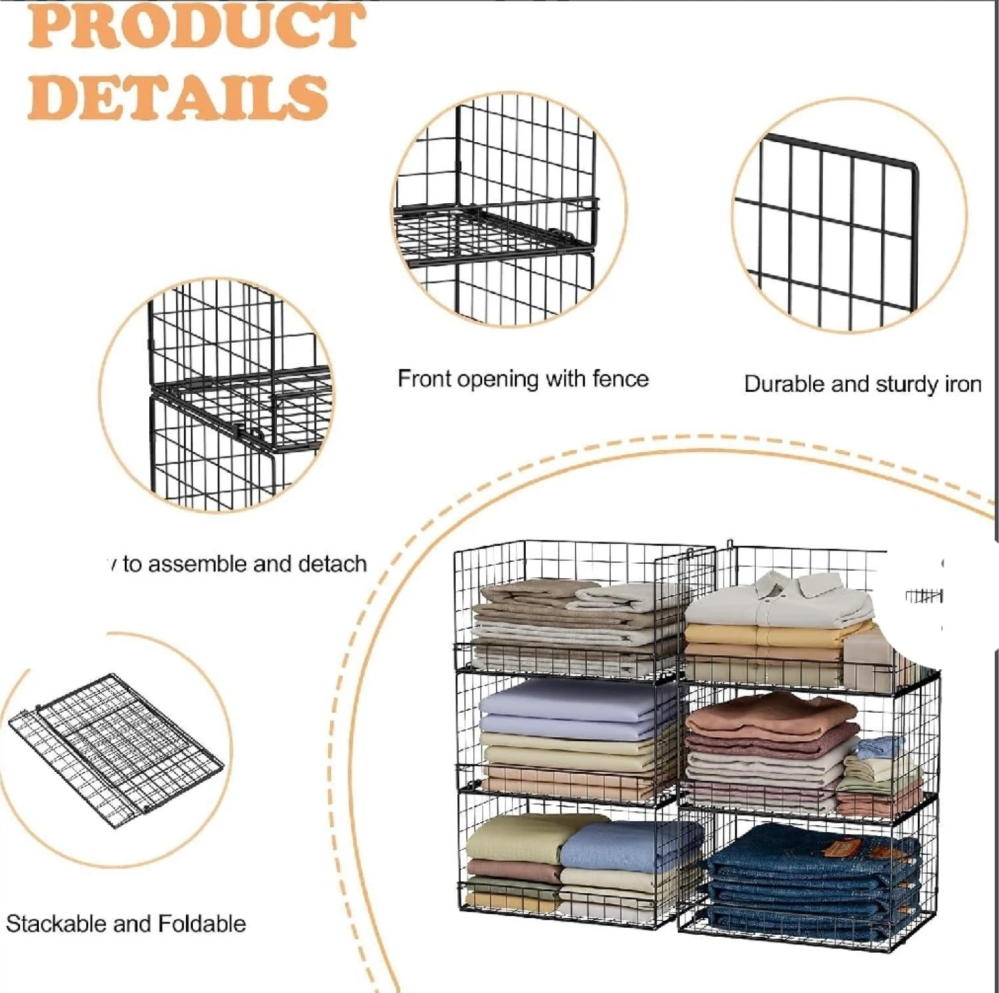 This is a 6-tier wire storage shelf unit. It's made of durable iron with a front opening and fence design. The unit is stackable and foldable for easy assembly and disassembly.