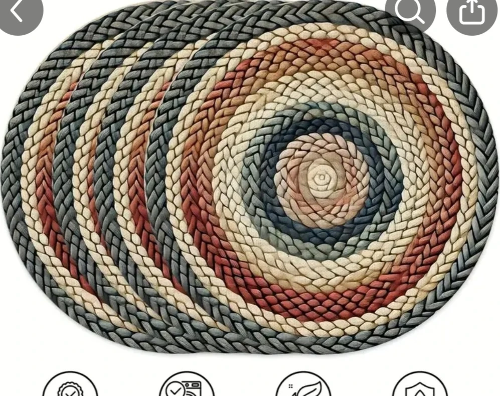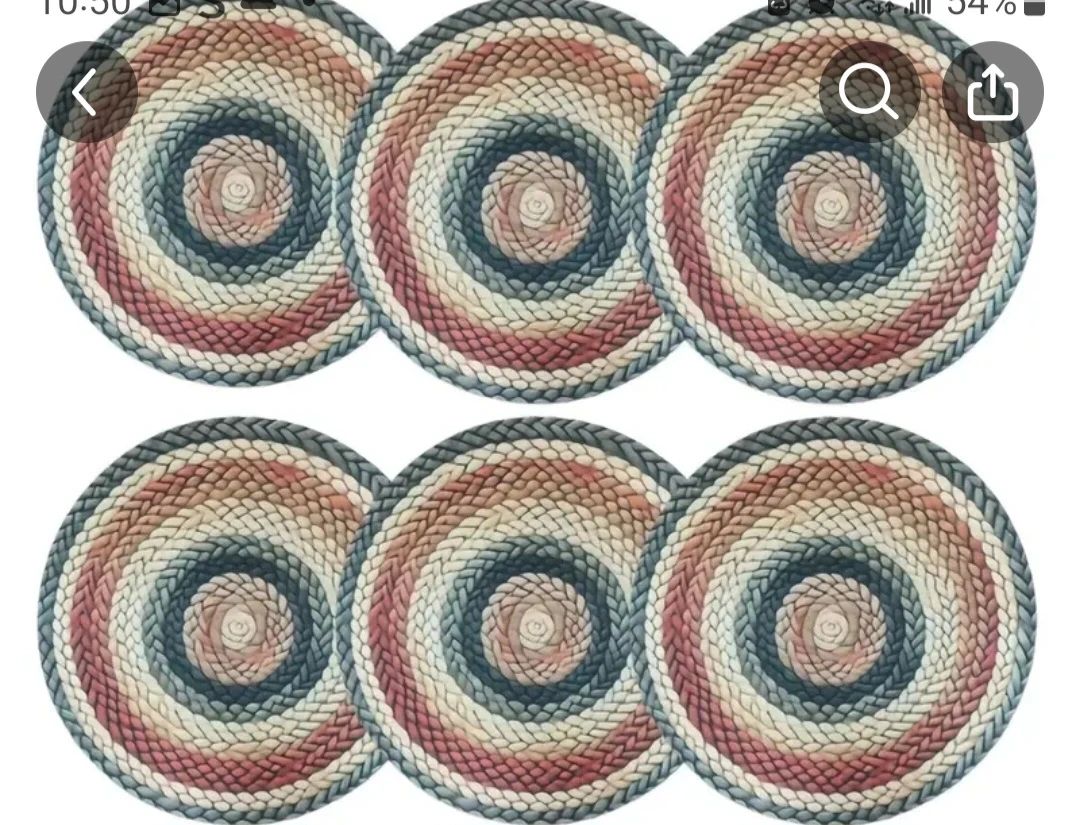 These are round placemats with a braided design. They feature a neutral colour palette with cream, beige, red, and grey tones. Perfect for everyday use or special occasions!