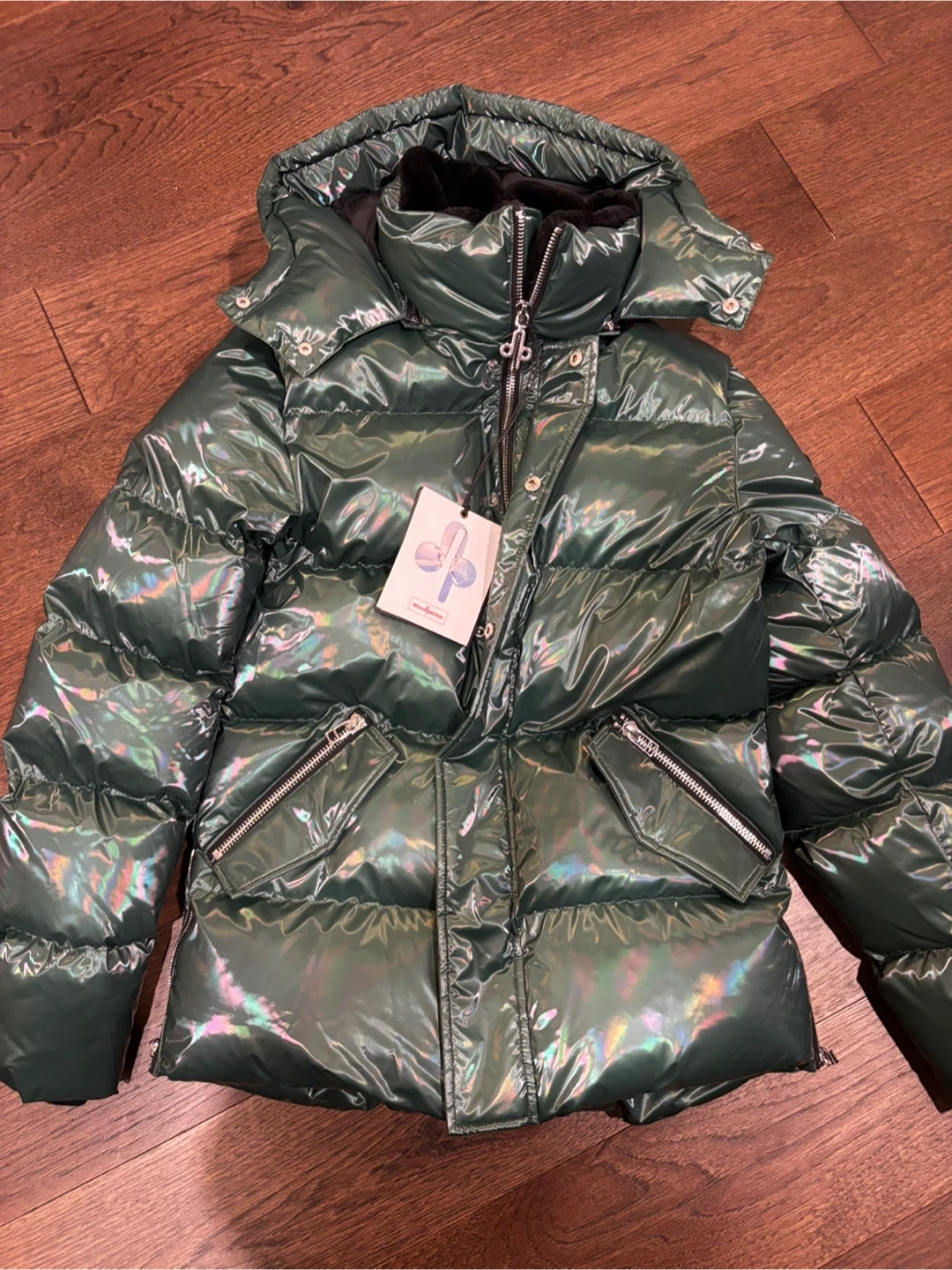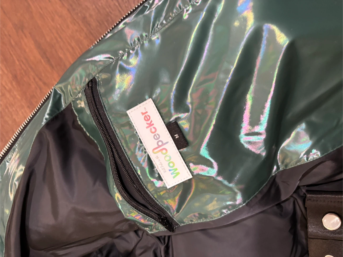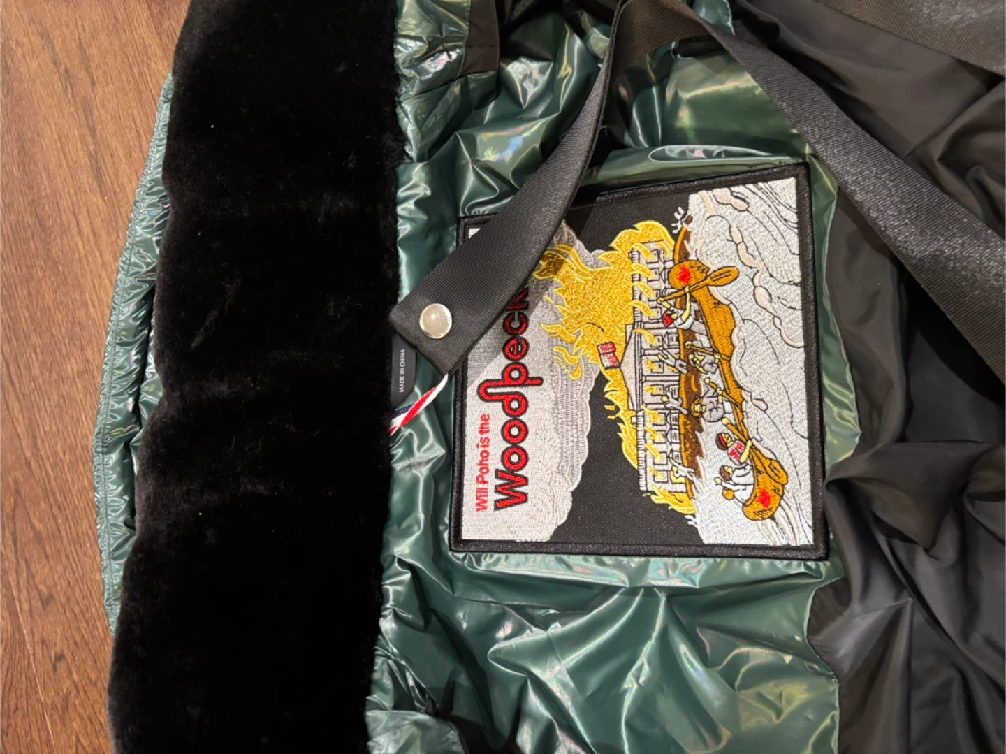 Brand new Shiny green Woodpecker puffer jacket with a faux fur-lined hood. Size M. It features zippered pockets and a distinctive woodpecker patch.