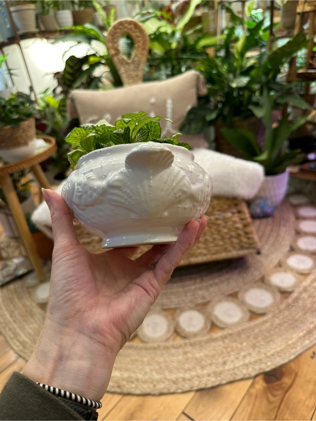 Charming white vintage sugar bowl with seashell motif and a white Fittonia Nerve Plant. My and bottom drainage with a plug to protect your furniture
