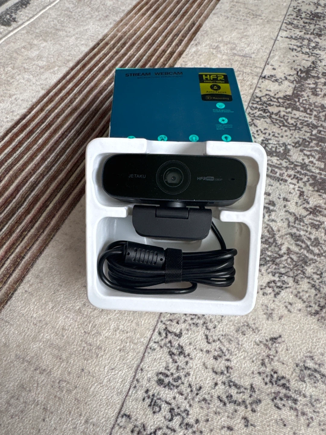 This is a Jetaku stream webcam with 1080p resolution. It features auto-focus and a built-in microphone. It includes the original box and all accessories.