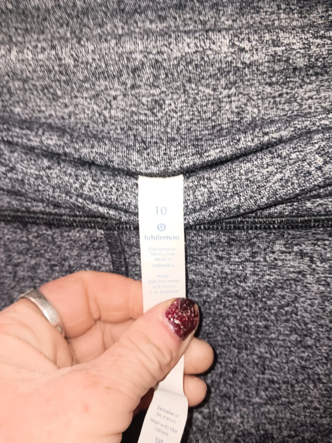 Lululemon athletic leggings in a grey speckled pattern. Size 10. Made with a polyester and elastane blend for a comfortable fit.