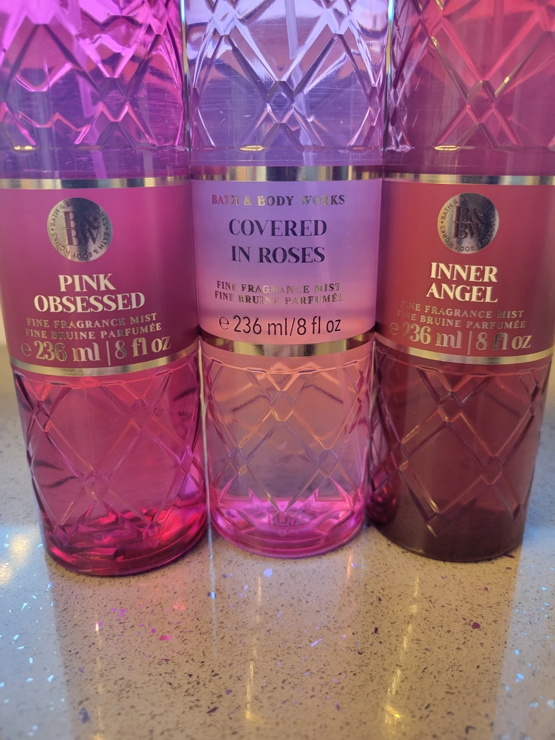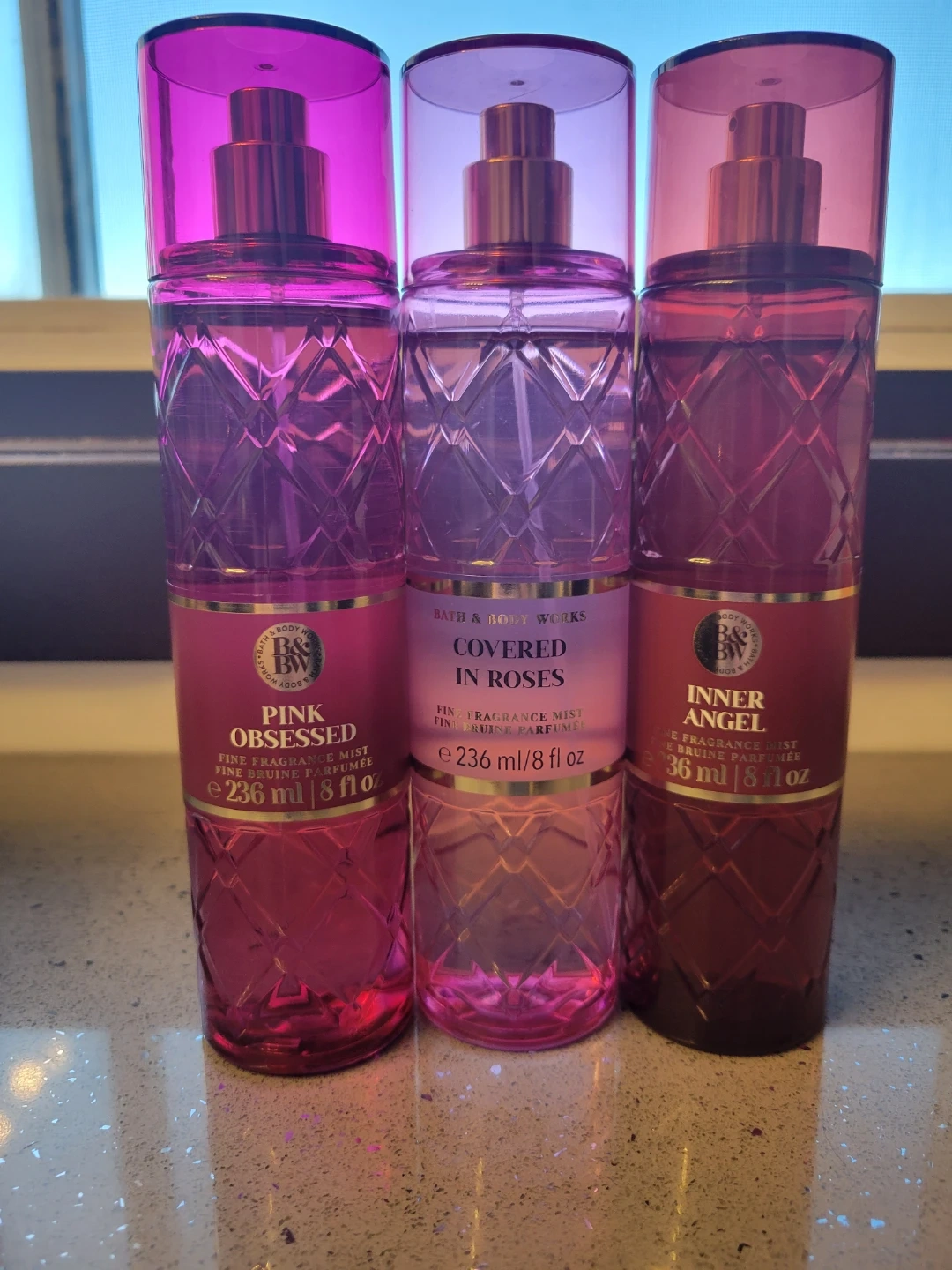 This collection includes three Bath & Body Works Fine Fragrance Mists. Each bottle contains 8 fl oz (236 ml) of product. The scents are Pink Obsessed, Covered in Roses, and Inner Angel.