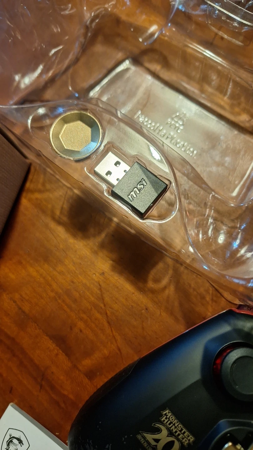 This is the MSI FORCE GC30 gaming controller in the Monster Hunter Edition. It's a wireless controller with a USB receiver included. It has a Monster Hunter 20th Anniversary design.