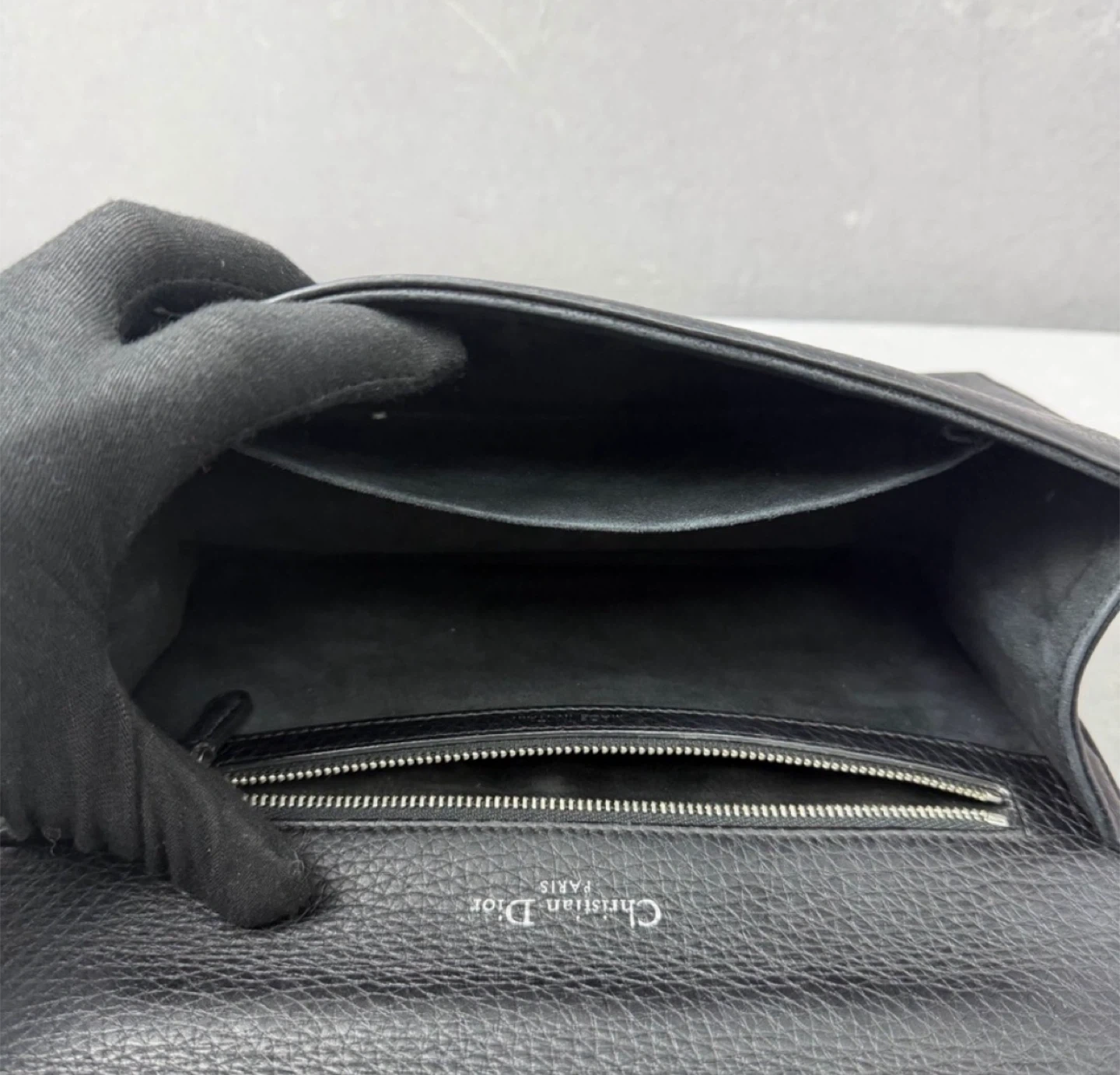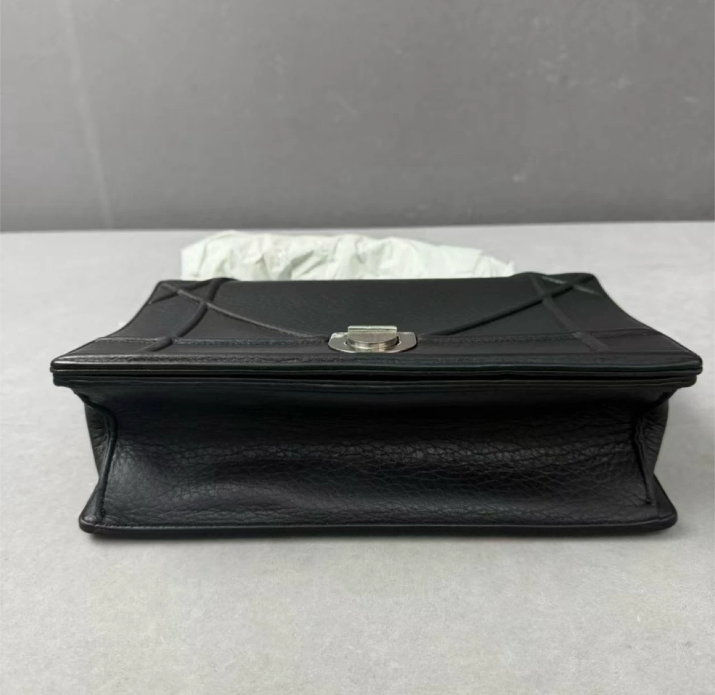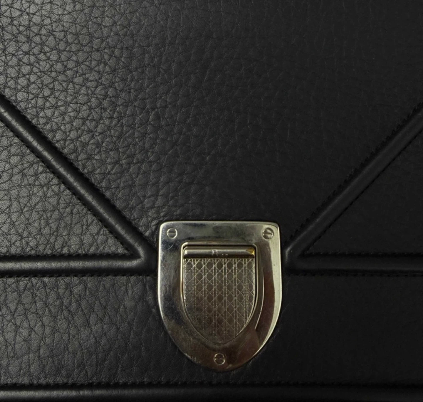 This is a black leather Dior chain bag. It features a textured leather finish and a signature clasp closure. Made with quality leather.