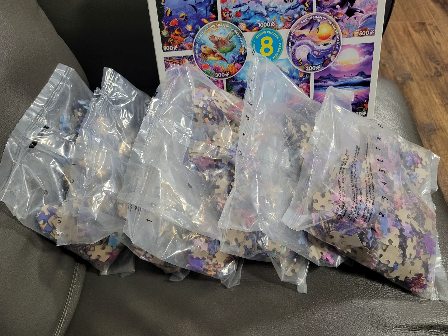 107Selling a Ceaco Par La Mer Seaside puzzle! It features 8 mosaic round shaped puzzles. All pieces are included and are in their original packaging inside the box. 6 of 8 packages