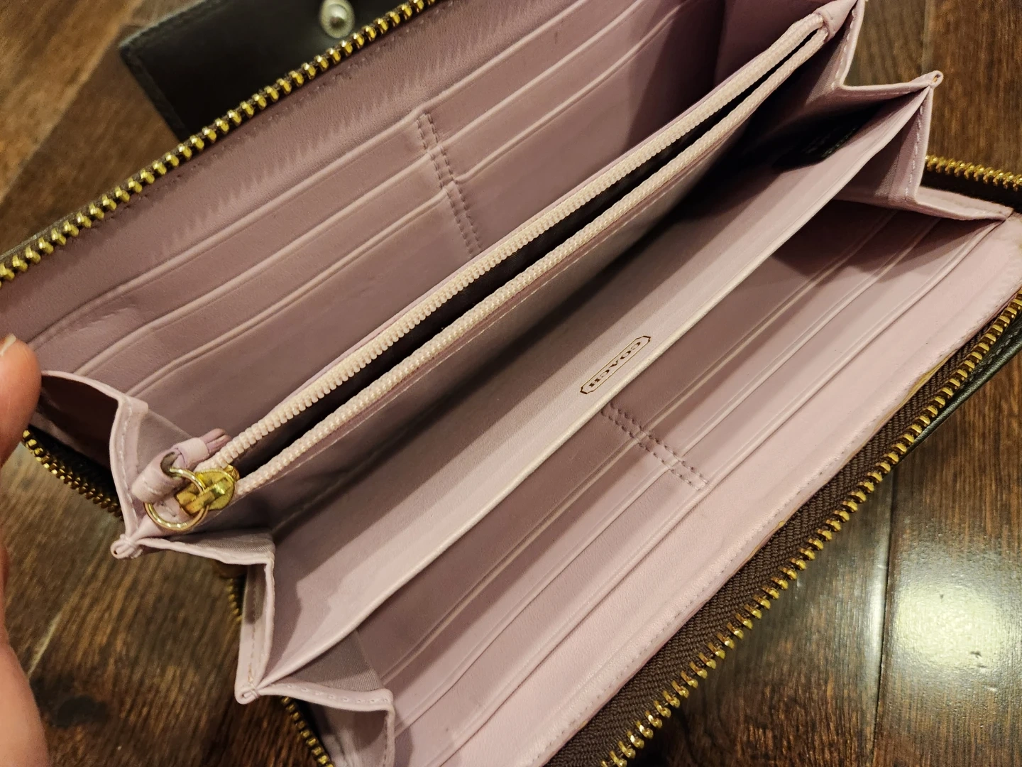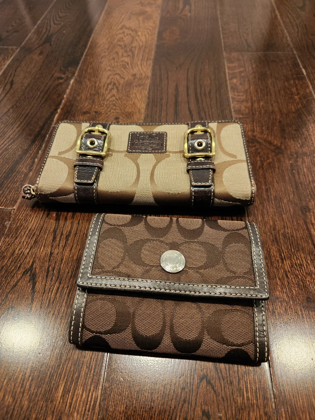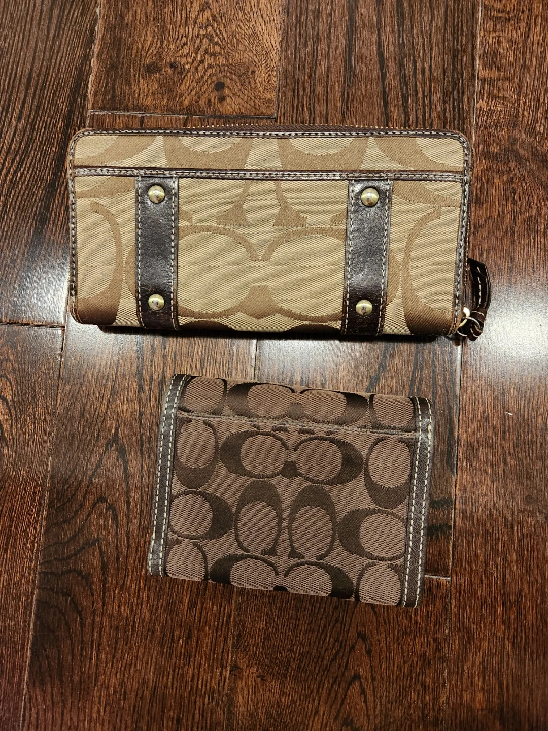 Two Coach signature C logo wallets in brown. Includes a larger zip-around wallet and a smaller bifold wallet. Both are made of coated canvas with leather trim and interior.