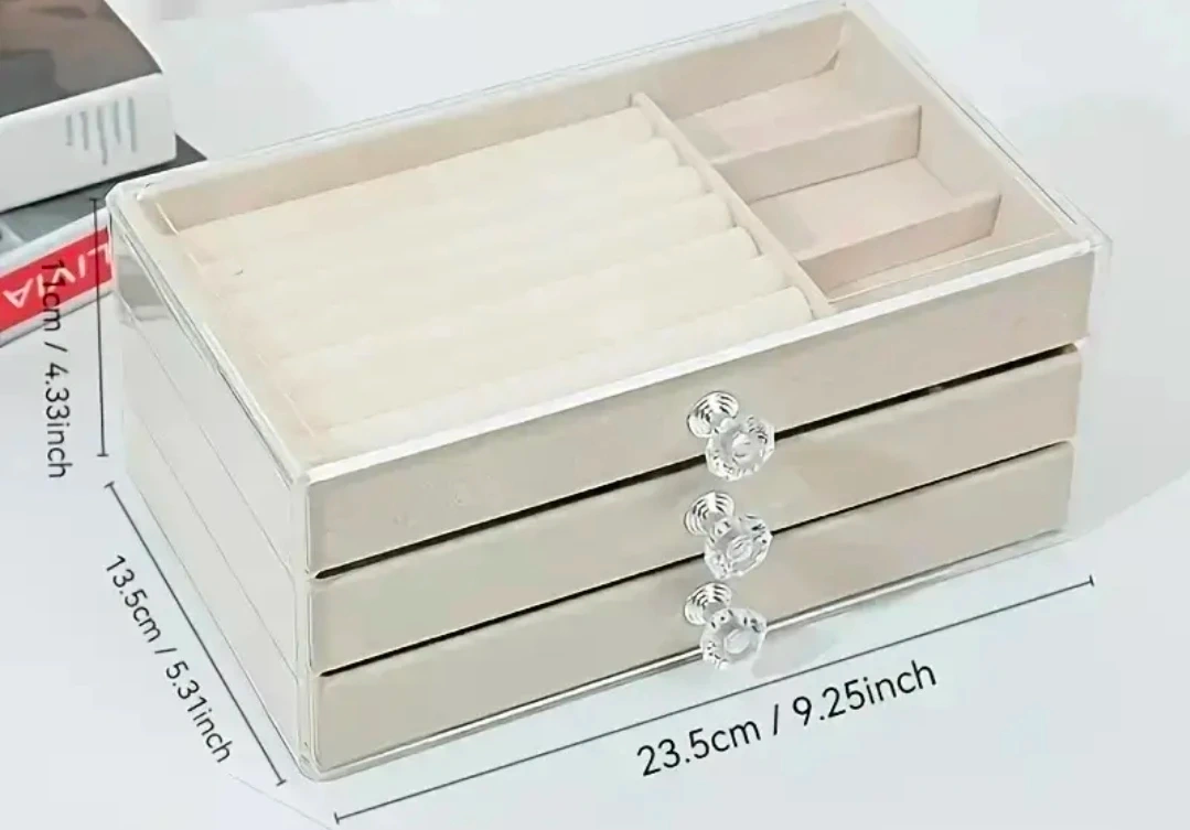 Keep your jewelry neatly organized with this lovely jewelry box! It features 3 layers of drawers to store your rings, necklaces, earrings, and other accessories. The clear top lets you easily see your collection, and the crystal-style knobs add a touch of elegance