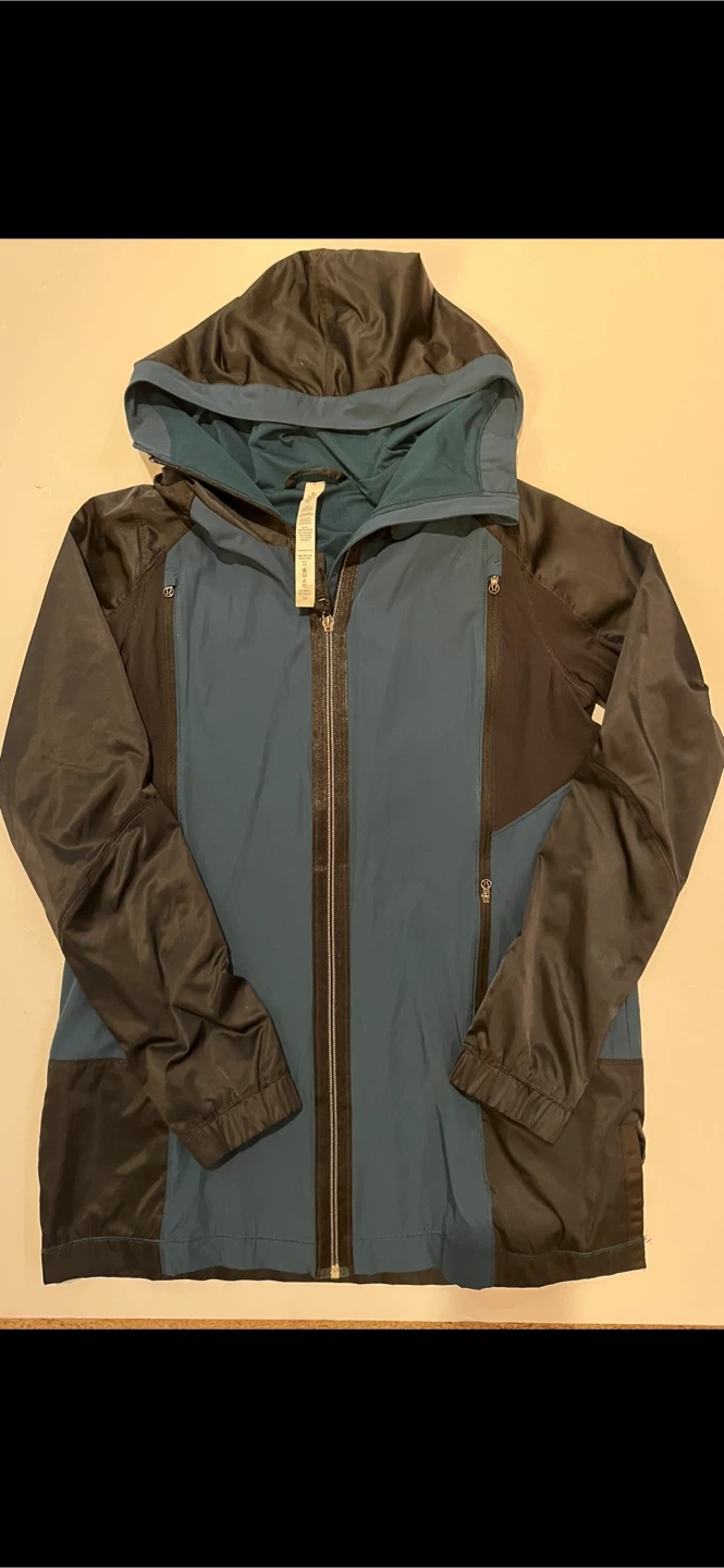 This Lululemon jacket features a hood and a full zip closure. It's designed with contrasting panels of teal and black. Includes zippered pockets for convenience.