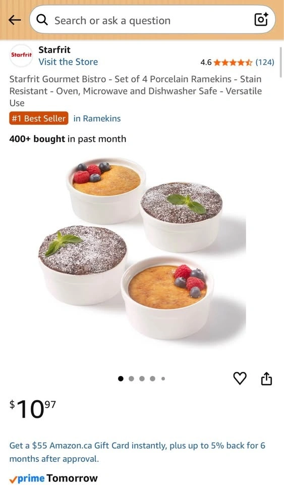 Starfrit porcelain ramekins, great for crème brûlée, soufflés, lava cakes, dips, prep bowls, etc. Used once and in excellent condition. Pickup: Downtown Vancouver (Smithe & Hornby).