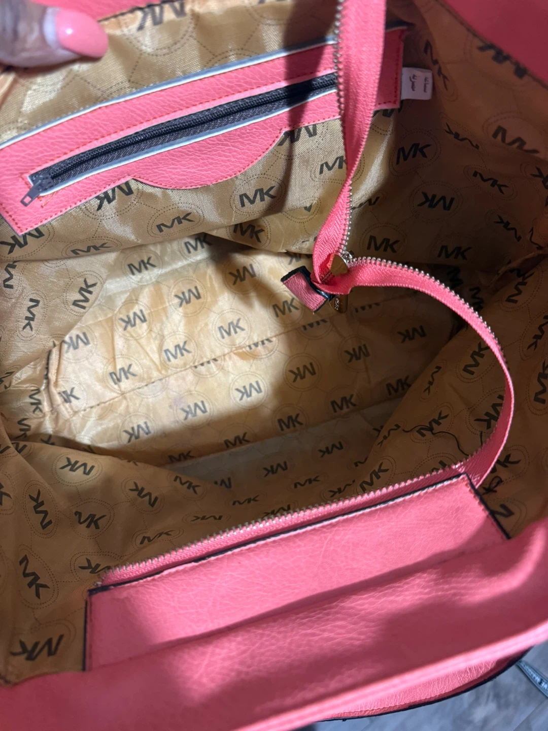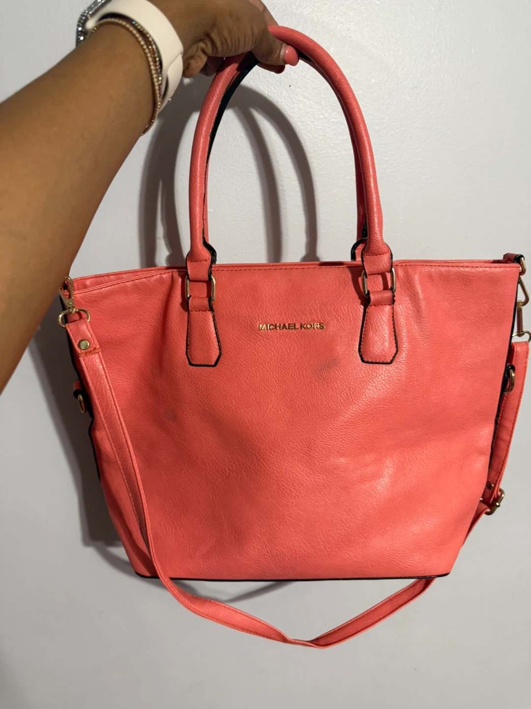 Michael Kors tote handbag in a coral pink color. It has dual top handles and a detachable shoulder strap. The interior is spacious for your essentials.