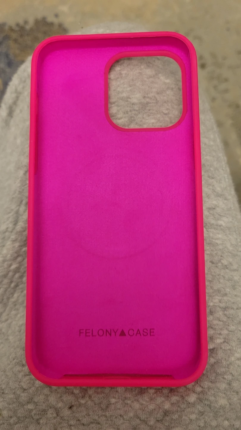 This is a pink Felony Case for an iPhone 13 Pro Max. It's designed with MagSafe compatibility. The case is made of silicone material. It's brand new and in excellent condition!