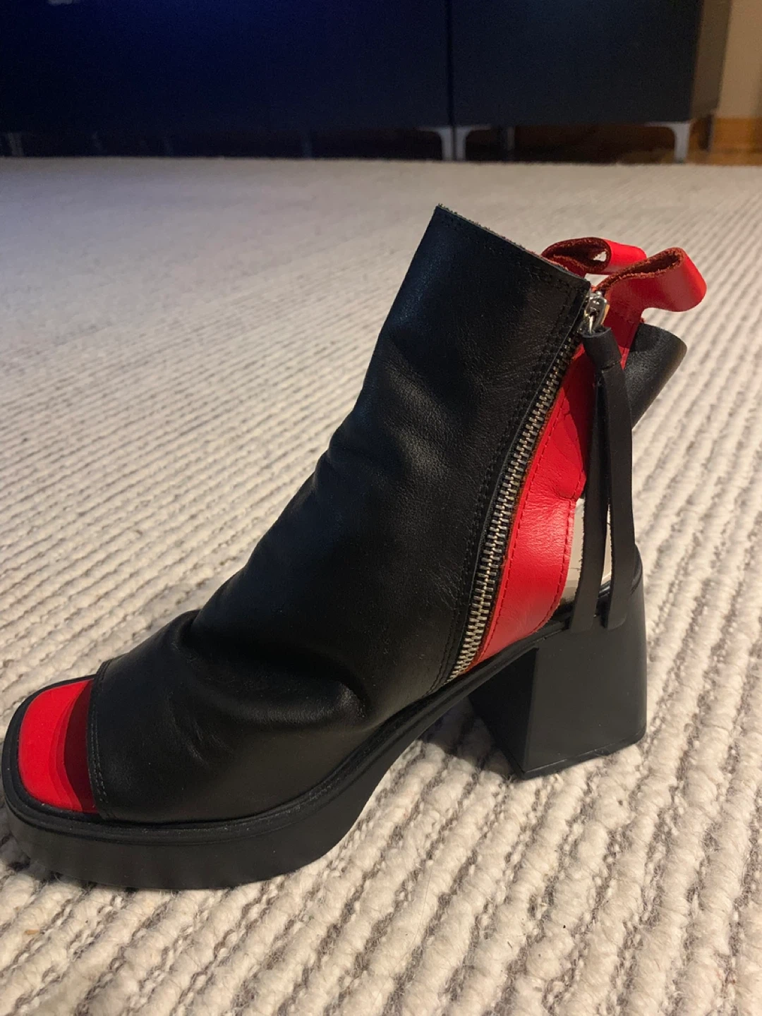 These are stylish black leather sandals with red accents. They feature a chunky block heel and a zipper closure for easy wear. The open-toe design is perfect for warmer weather.