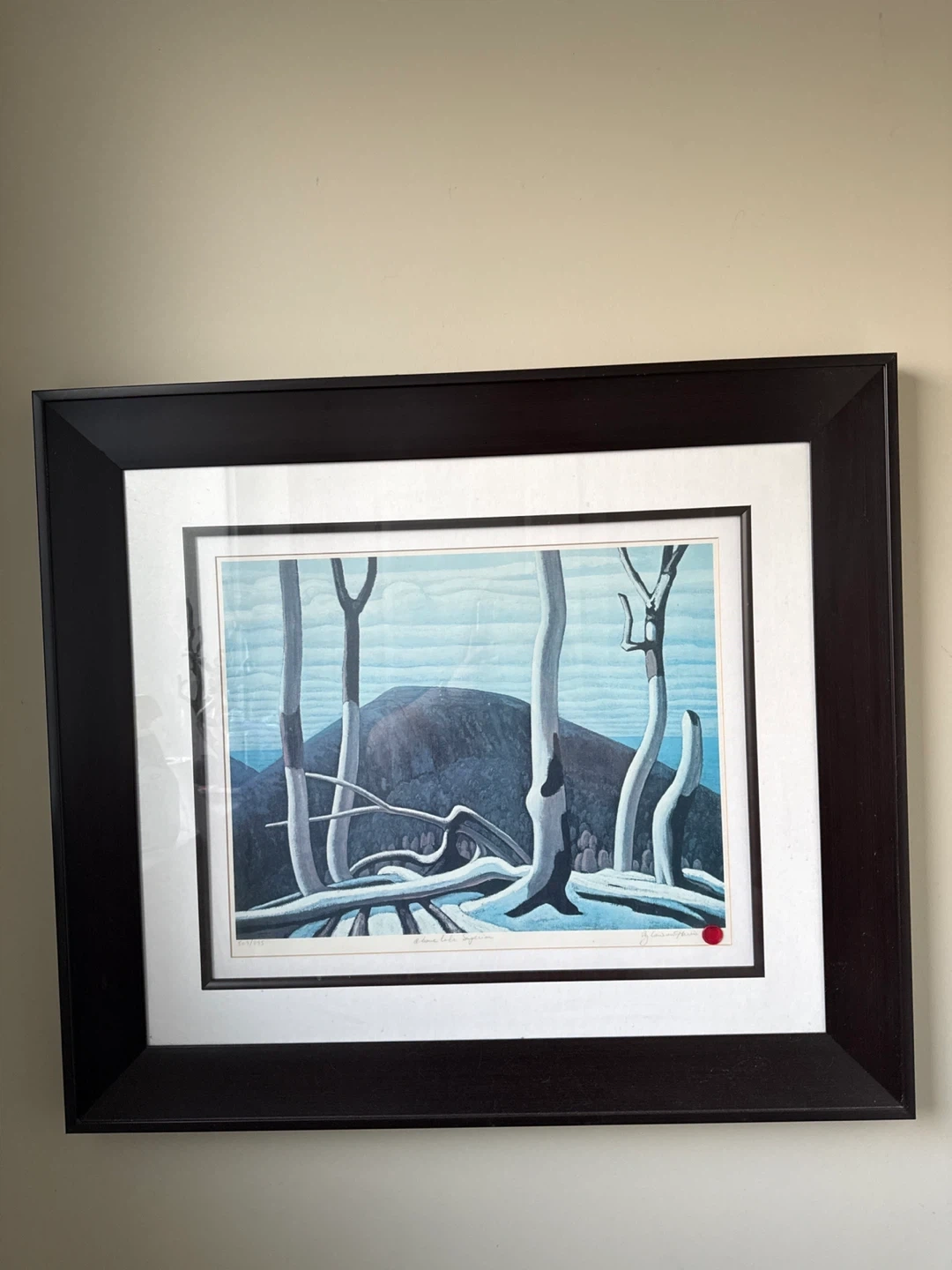 The print depicts a serene winter landscape with bare trees and a rocky mountain in the background. It's matted and housed in a dark wooden frame. This piece is signed by the artist and includes a small red seal. This print would make a wonderful addition to any art collection or home decor.