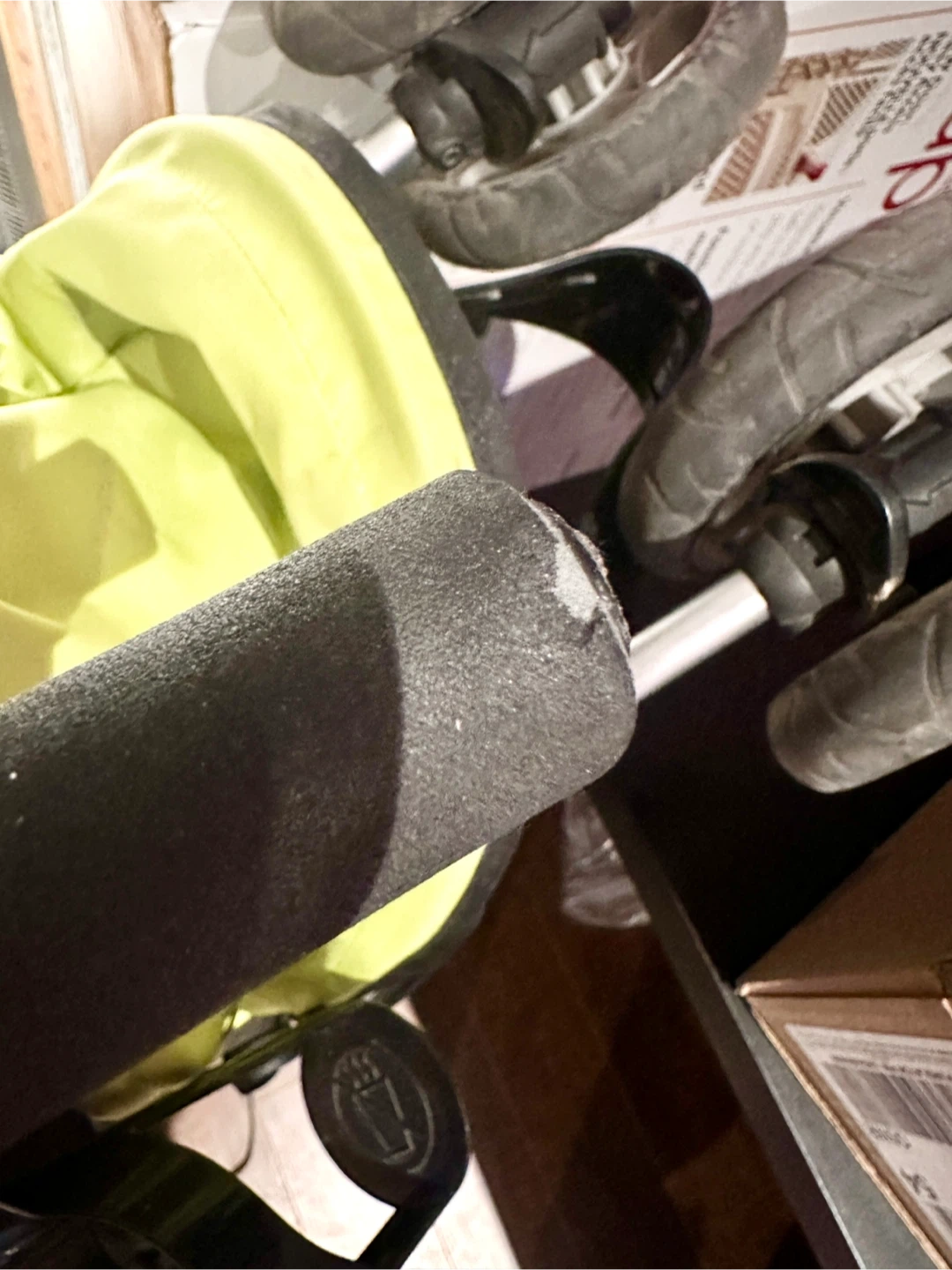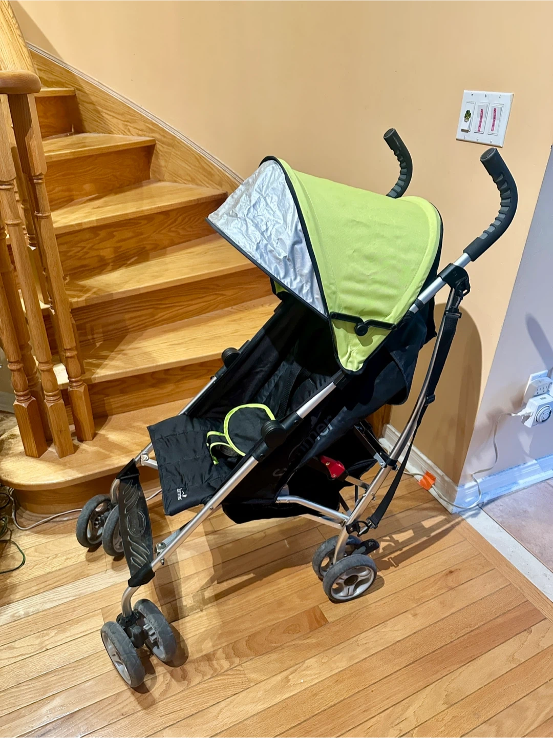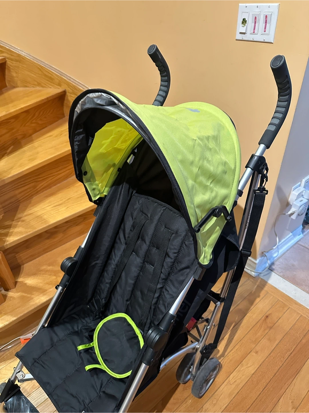 Somewhat discoloured canopy and slight wear and tear on the handles (see photos). But everything is in great working condition.