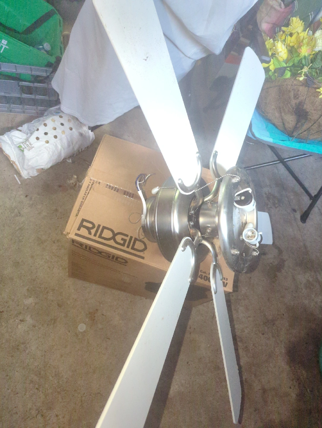 A used ceiling fan. It has five blades and a light fixture in the center. It would be great for a bedroom or living room!