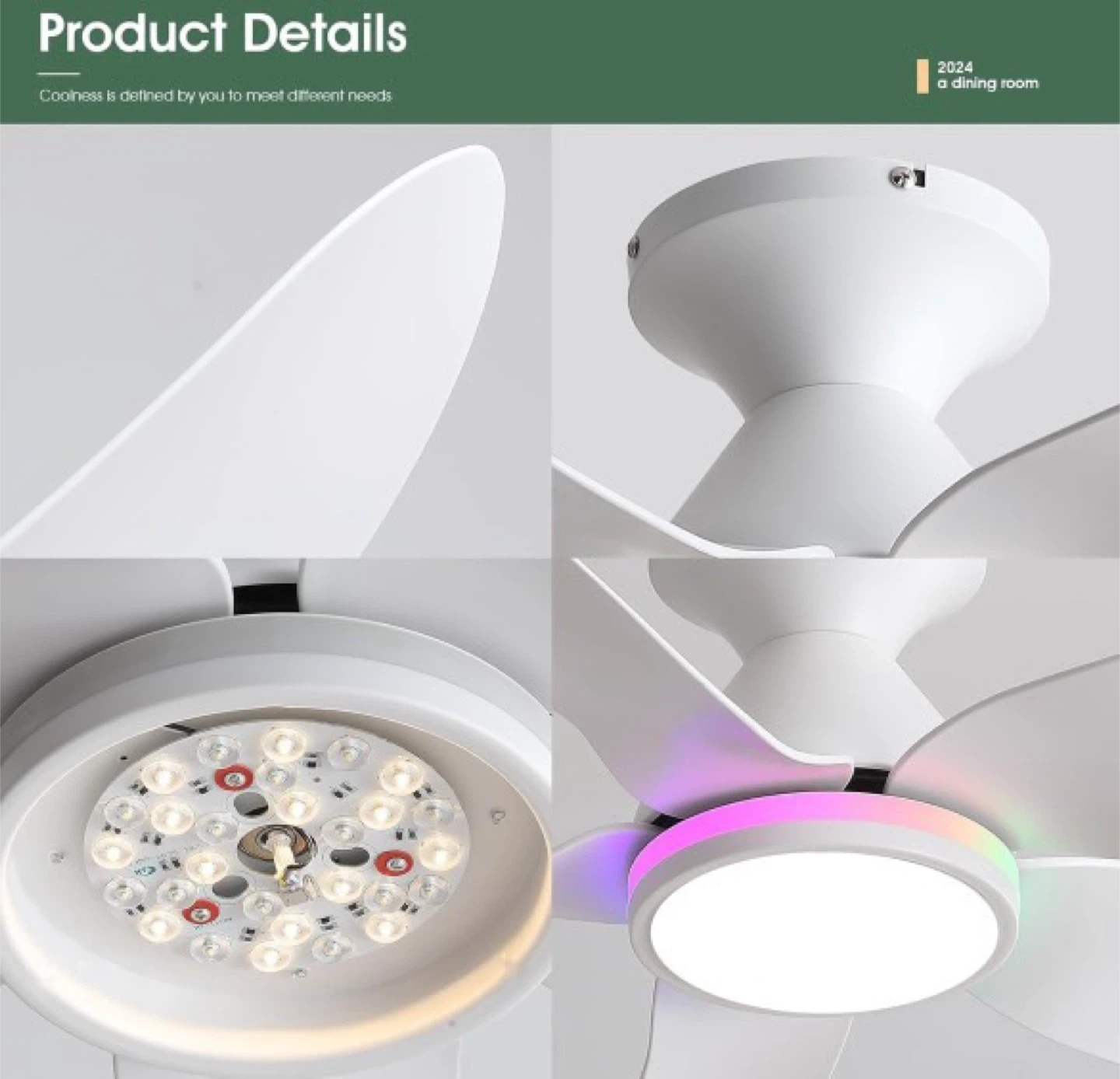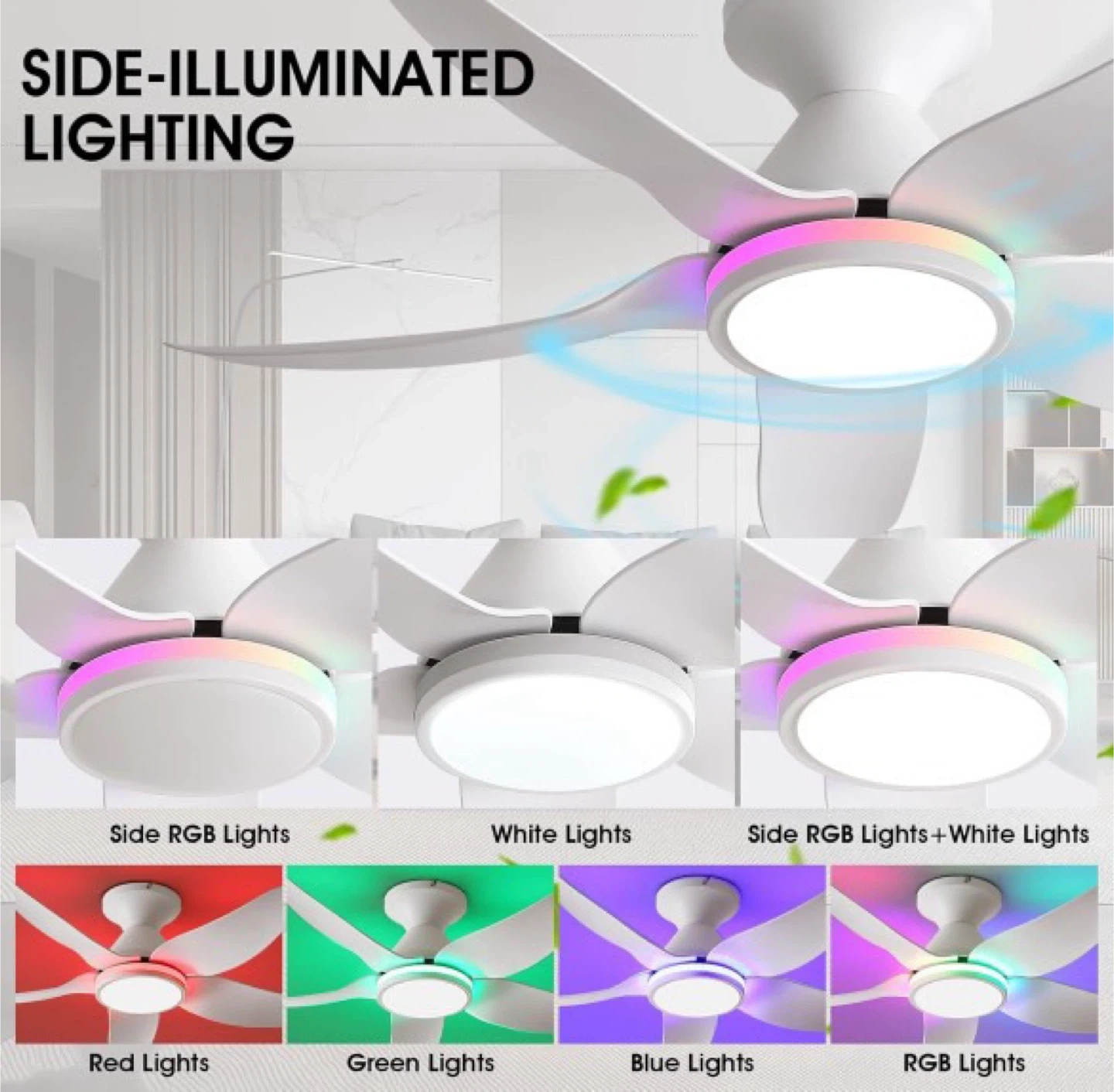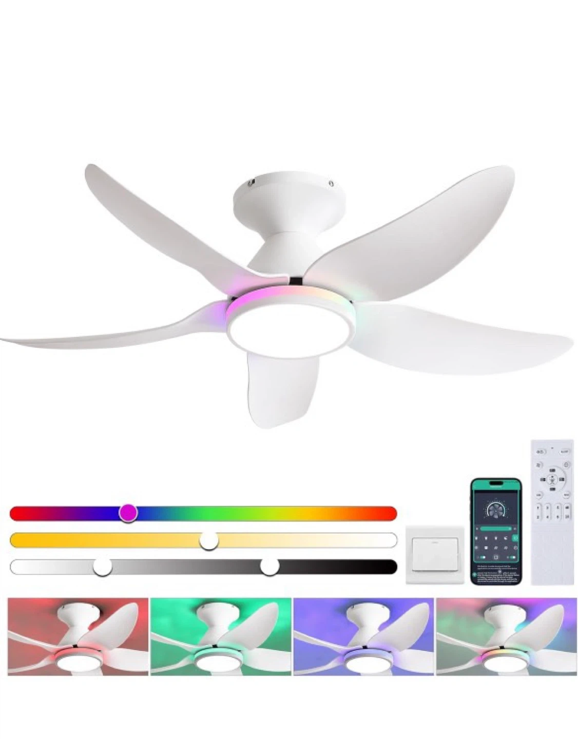 10Kviflon Ceiling Fans with Lights Remote/APP Control, 38” Low Profile Ceiling Fans with Dimmable White Colors+Ring RGB Lights, 6 Speeds 5 Reversible Blades for Kids Room Bedroom Living Room, White