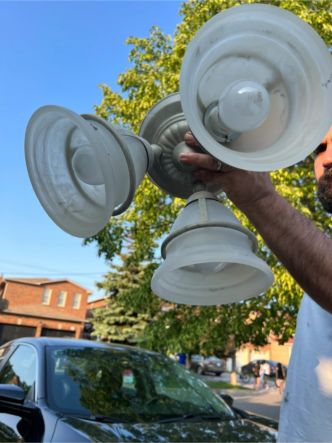 70Selling a used ceiling light fixture with 3 lights. It has a silver finish and frosted glass shades. Good condition! Pickup at creditview and Britannia in Mississauga