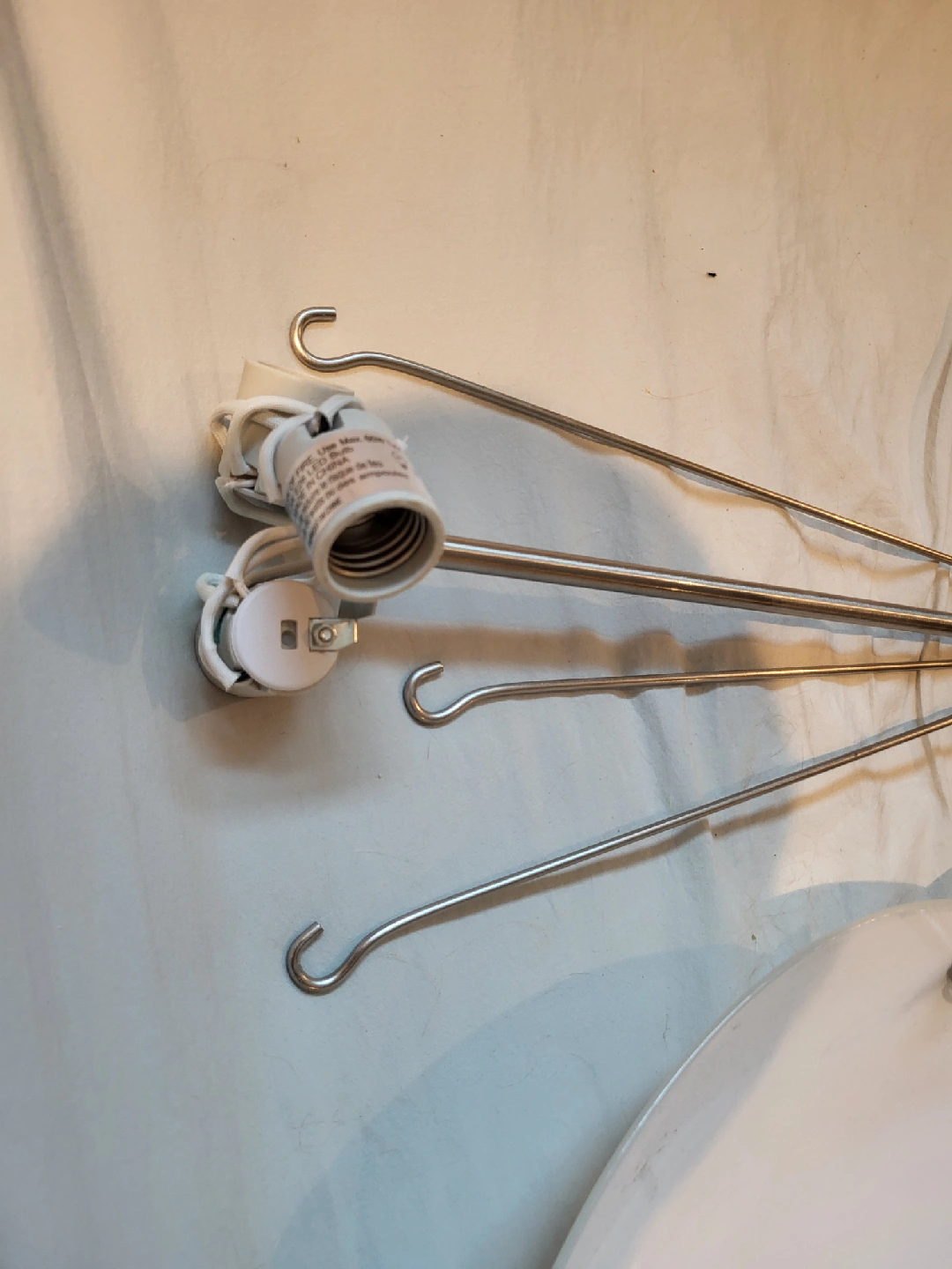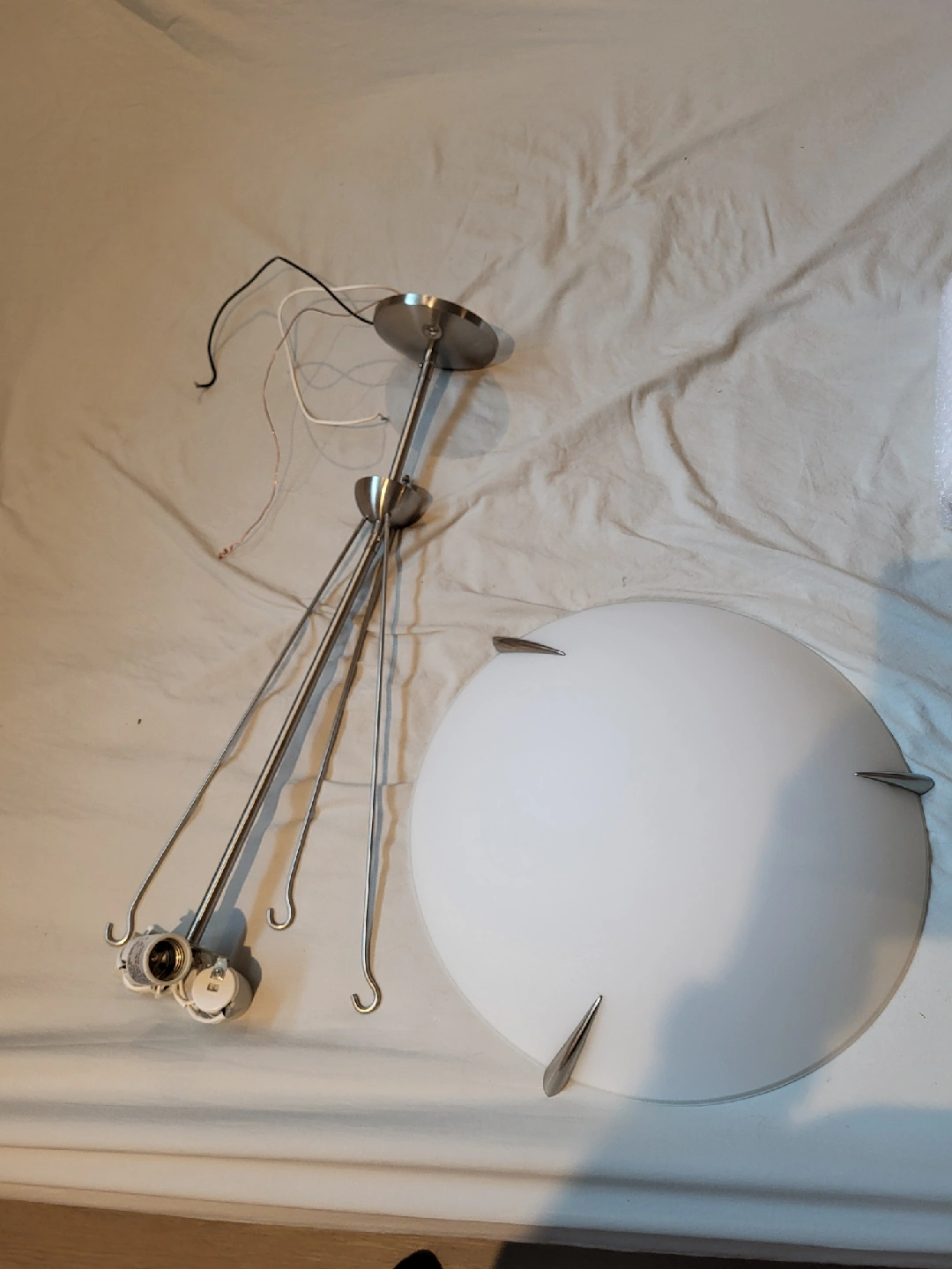 Selling a ceiling light fixture. It's in good condition and ready to brighten up your space! The fixture features a white, round shade and silver-toned metal components.