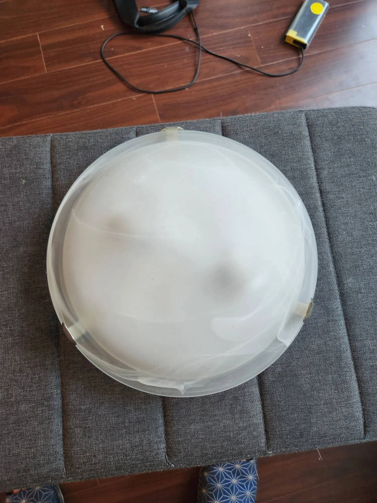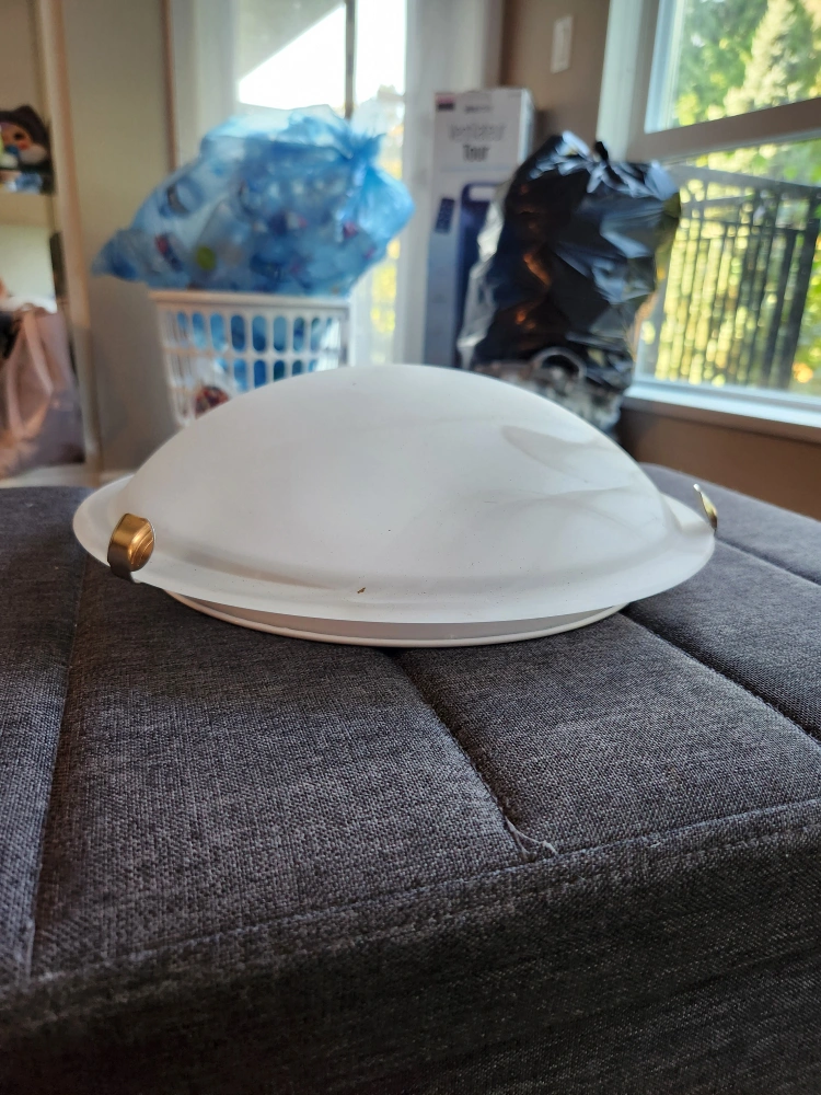 Selling a gently used ceiling light fixture. It's a nice, simple design that would fit well in many rooms. The light is white and round, ready to brighten up your space!