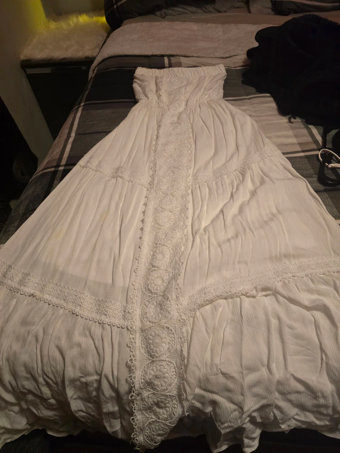 A white strapless maxi dress with a tiered skirt and lace trim. It has a stretchy smocked bodice for a comfortable fit. Great for warm weather outings!