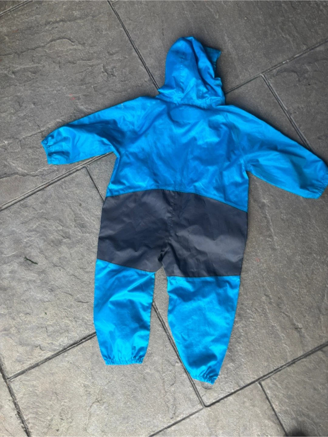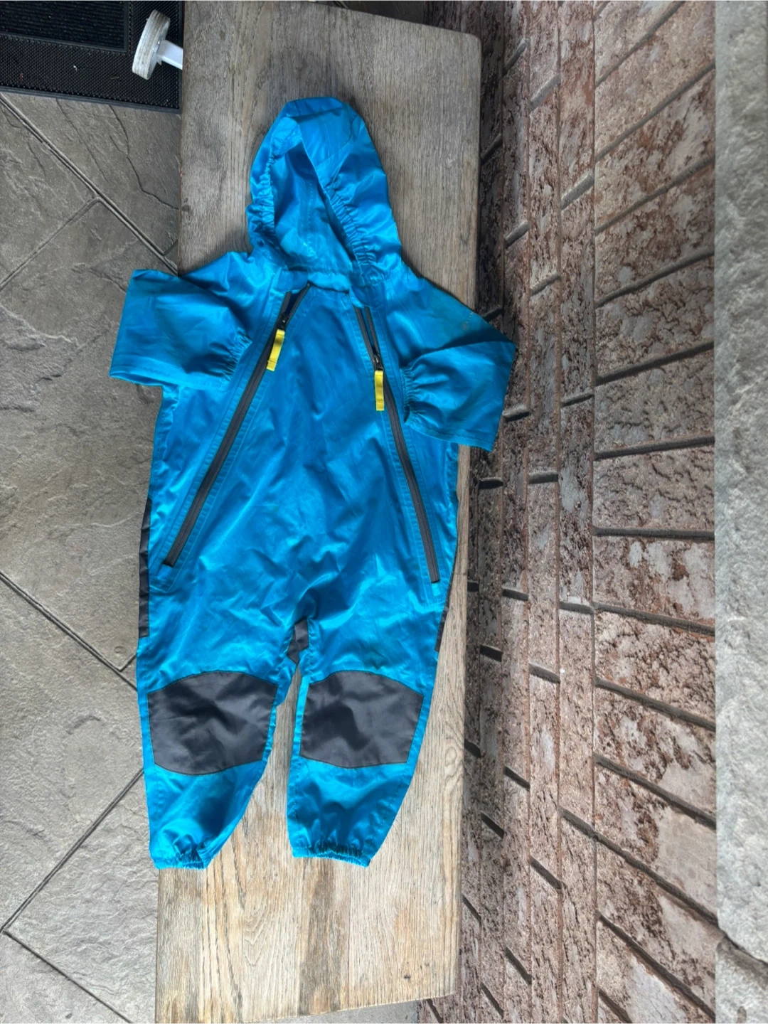 75Celavi rain suit in size 100. Perfect for puddle jumping and staying dry on rainy days! The suit is blue with gray reinforced knees.