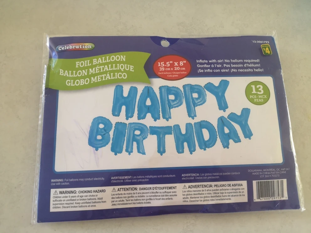 15Brand new in packaging! This Celebration foil balloon set spells out "Happy Birthday" in a bright blue colour. Perfect for your next birthday party! The package measures 15.5" x 8" (39 cm x 20 cm) and includes 13 pieces. Was only able to put $5 but will sell for $4. Pick up only thanks!