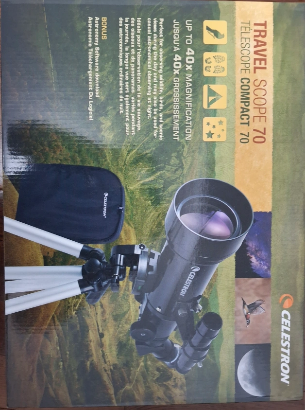 Looking to explore the stars or just get a closer look at nature? This Celestron Travel Scope 70 is perfect for observing wildlife, birds, and scenic views during the day, and even casual astronomical observing at night! It can magnify up to 40x. The box includes bonus astronomy software for download too