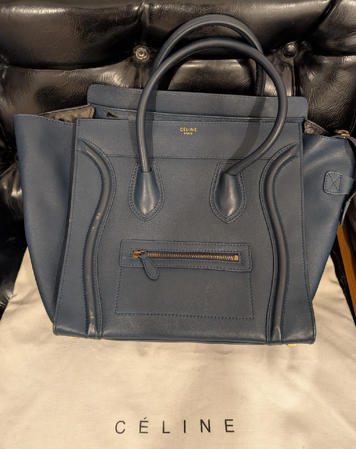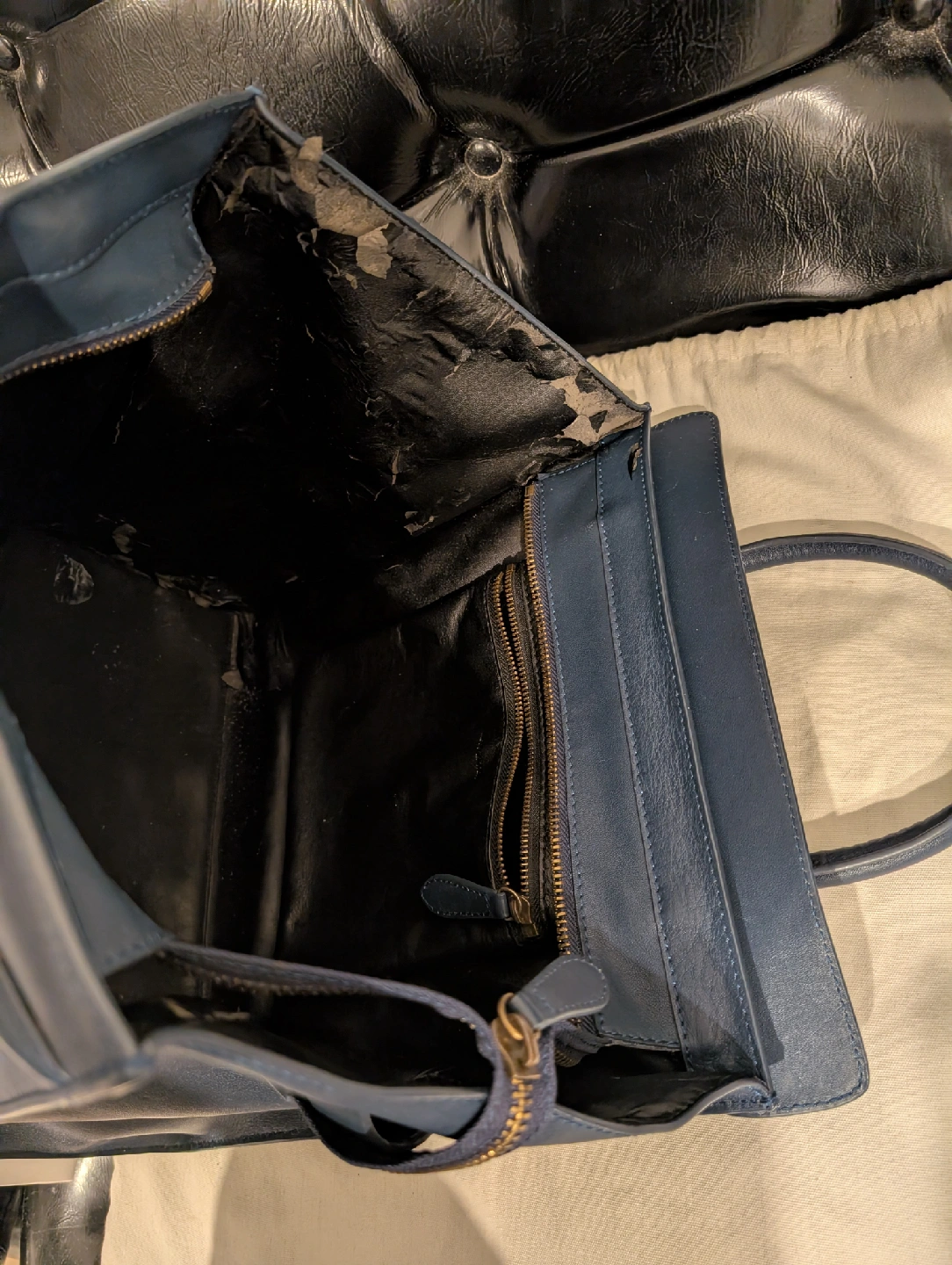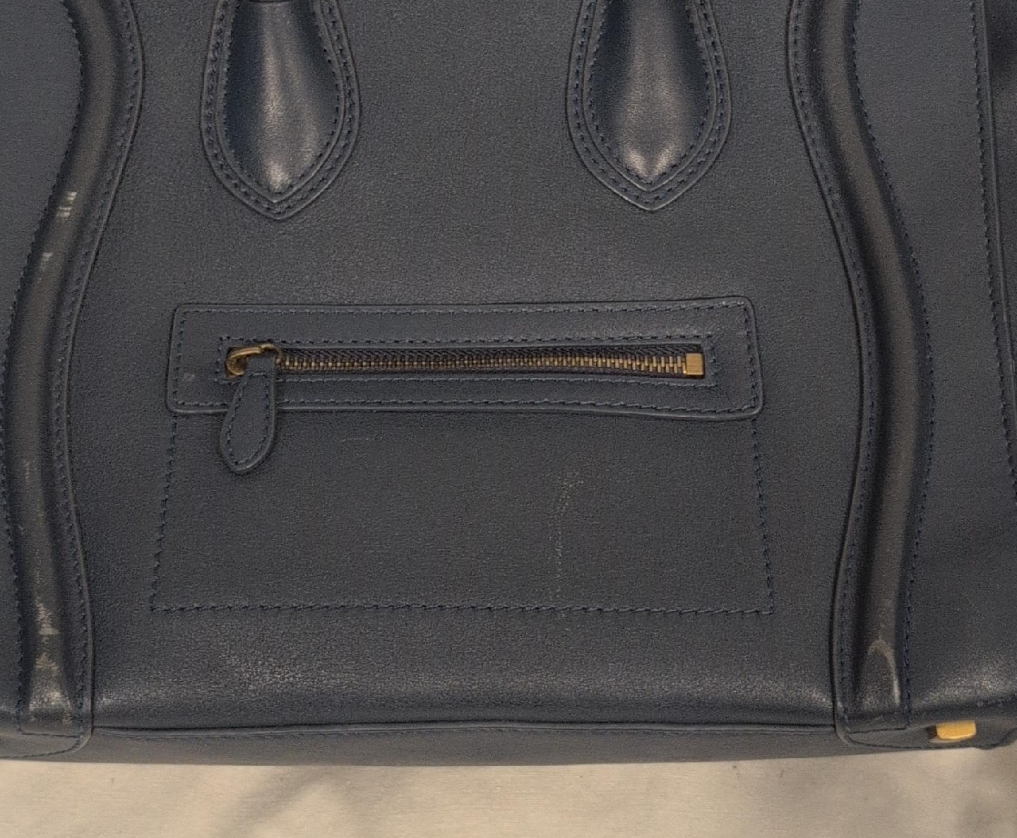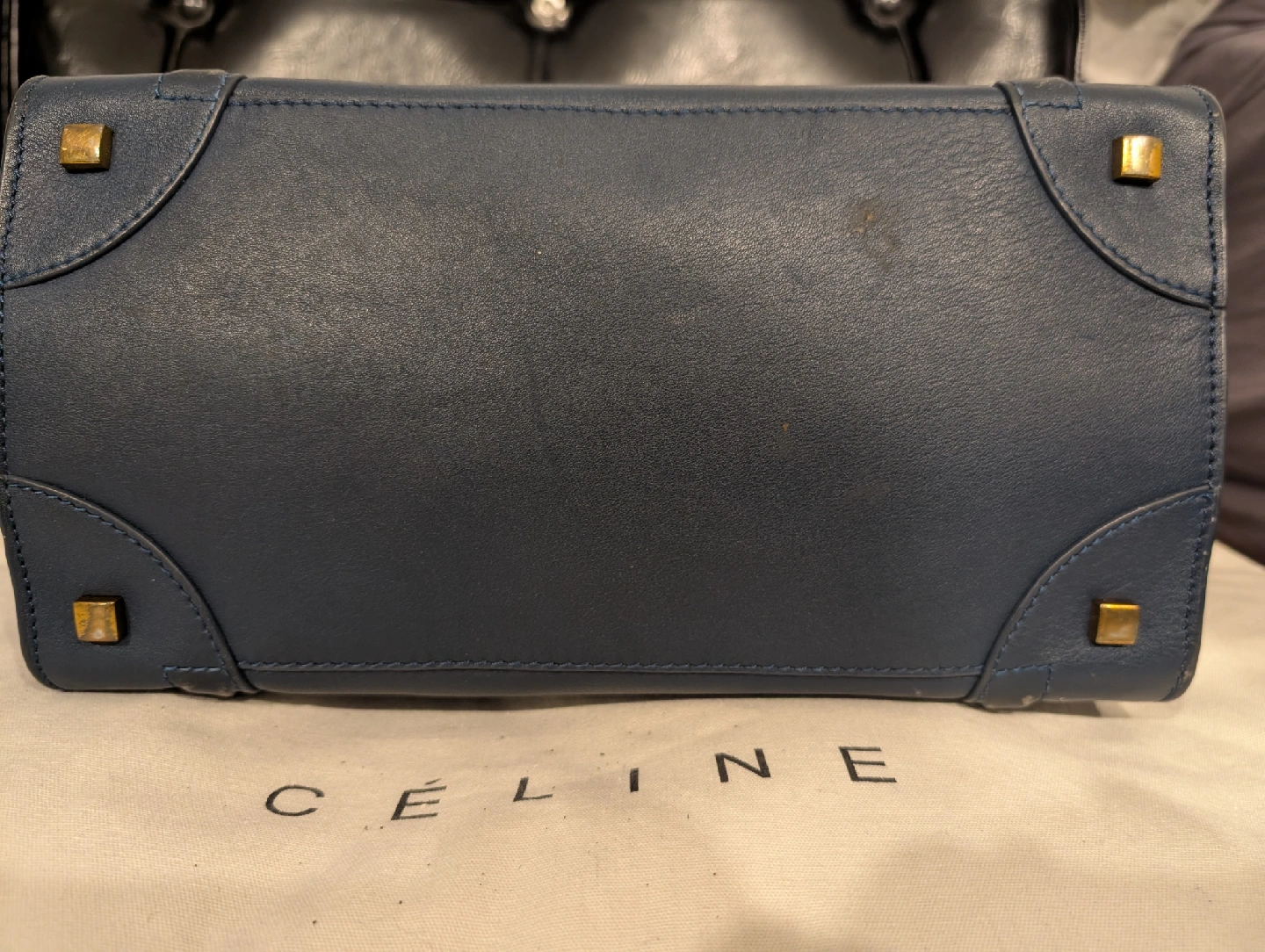 Selling a Celine handbag in blue leather. It shows signs of wear, particularly inside. Please see the photos for details on the condition.