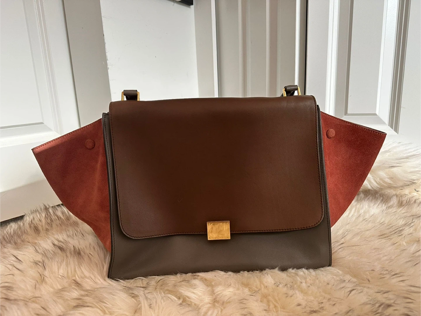 65Selling a beautiful Celine handbag! It's in great condition and has a stylish design. The bag features a combination of brown and gray leather, with a distinctive gold-tone clasp. "Made in Italy" is stamped inside