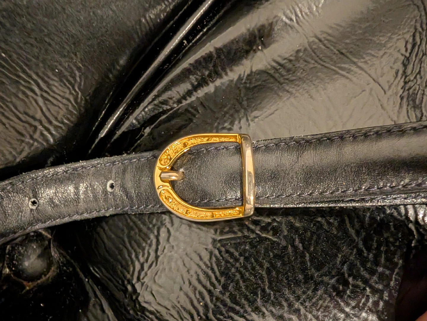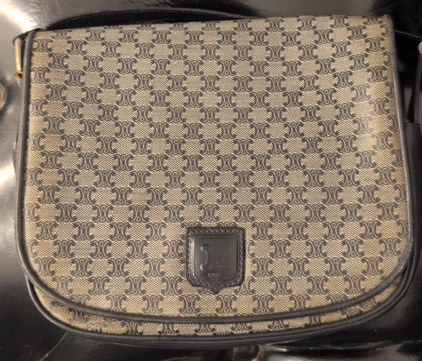 Celine Paris crossbody bag with a repeating pattern and black leather trim. The bag features a gold-tone buckle on the strap and a small interior zipper pocket. Great for everyday use