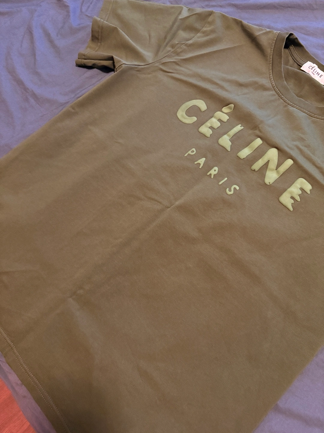 65The t-shirt colour is olive green! It’s in great condition and features the Celine logo across the front. Size is L & regular fit