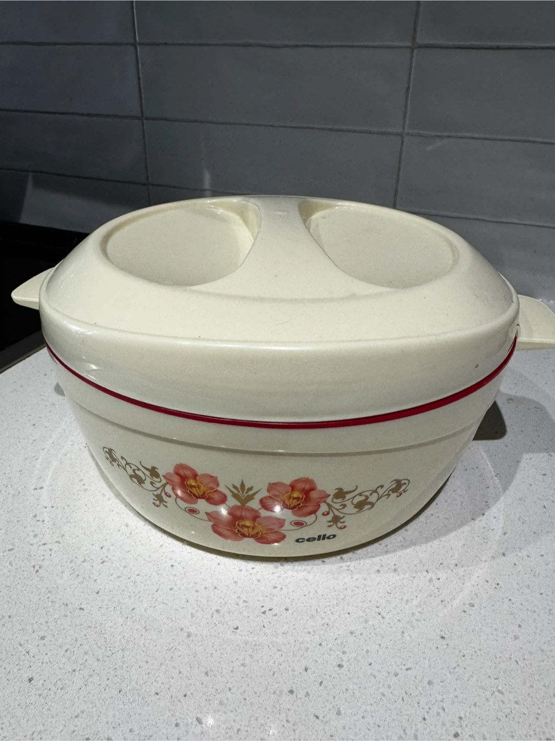 30Keep your food warm with this Cello hot pot! It's perfect for keeping dishes at the right temperature during meals or gatherings. The design is simple and elegant, with a cream colour and floral pattern. It's in great condition and ready to use