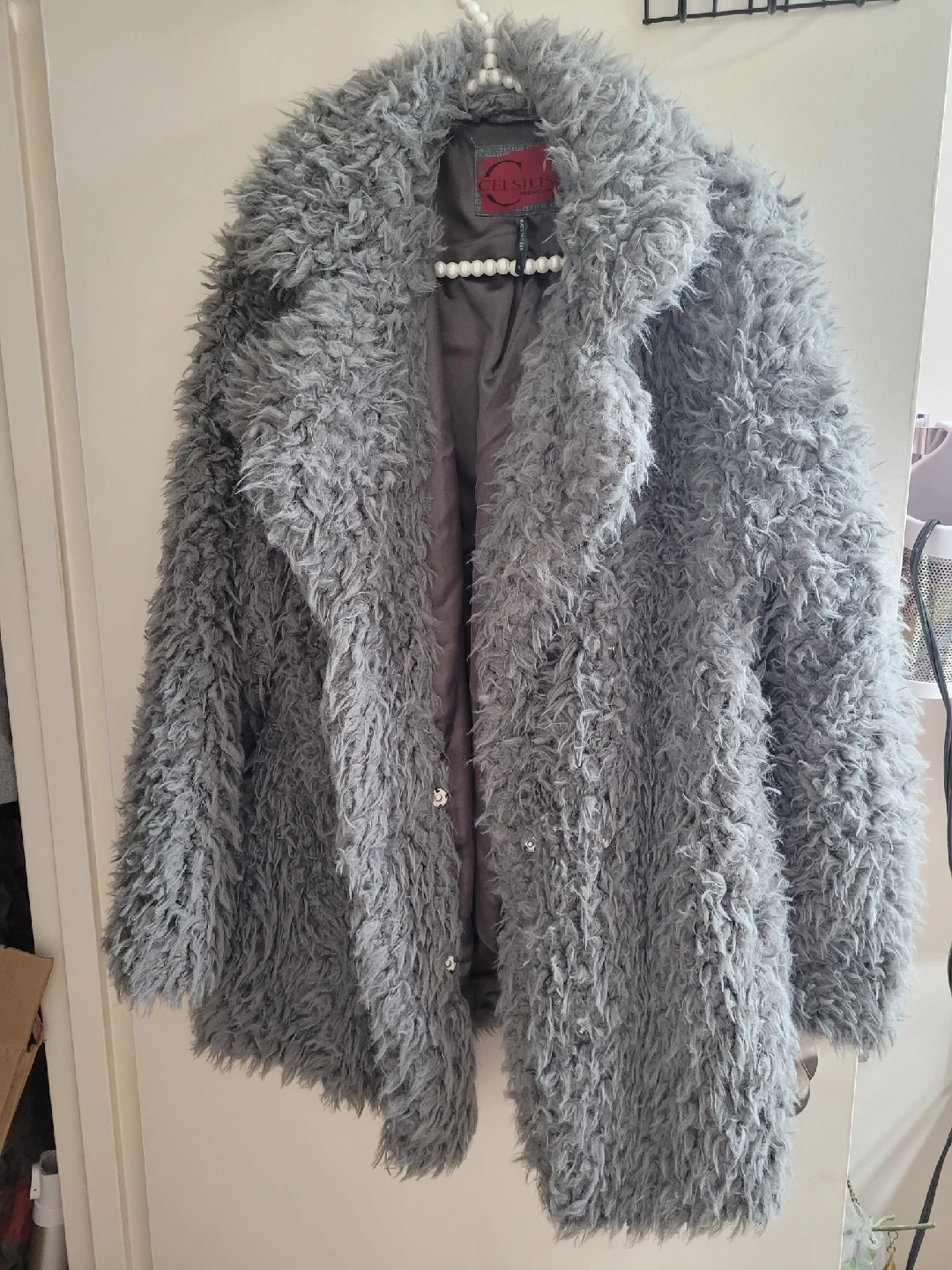 10Selling a Celsius brand faux fur coat in grey! It's super cozy and in great condition, perfect for adding a bit of warmth and style to your wardrobe. Cash only. Pick-up only.