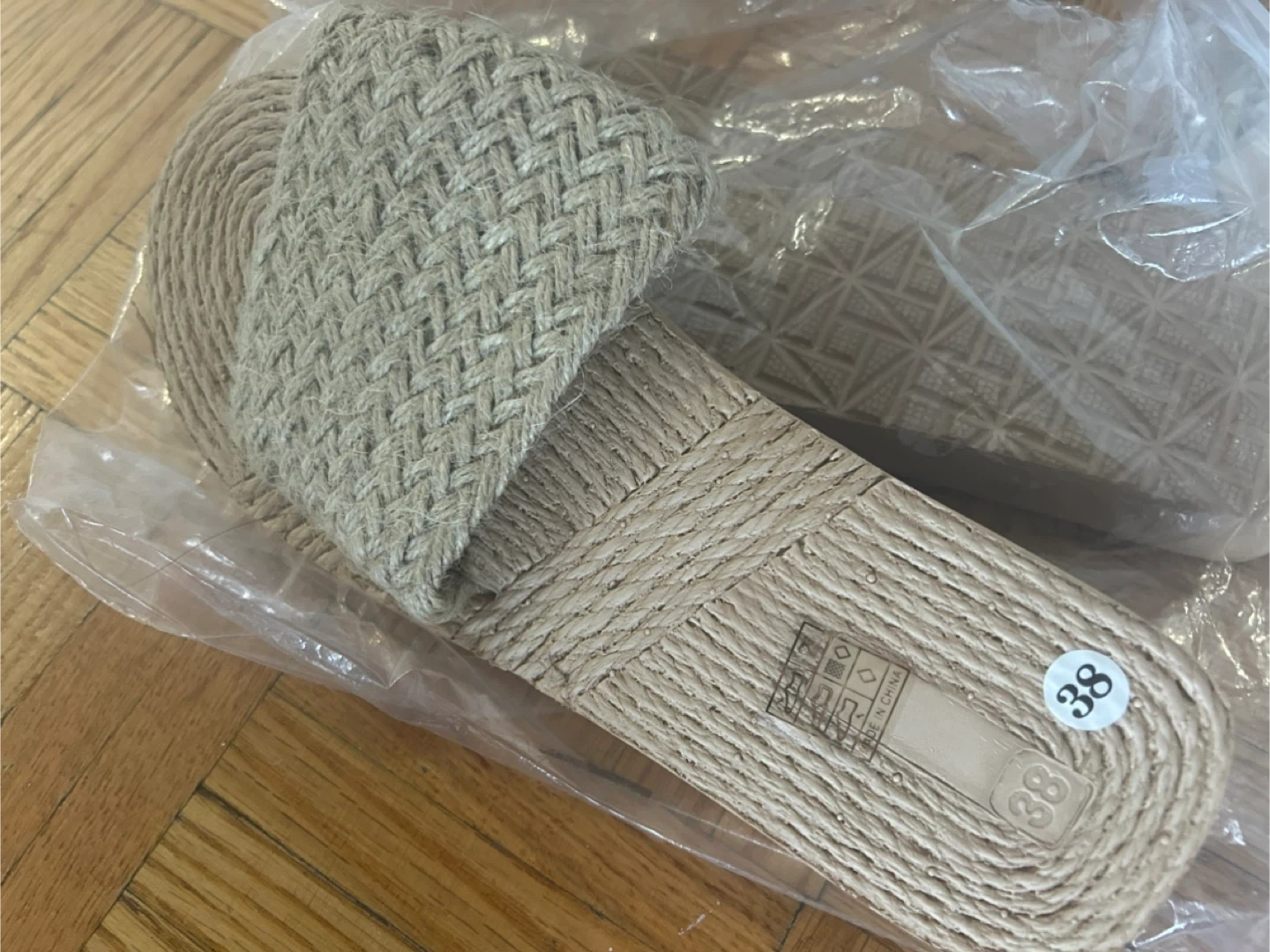 These women's espadrille slides feature a braided jute sole and strap. The size is 38. They're perfect for casual wear on warm days. Made in China.