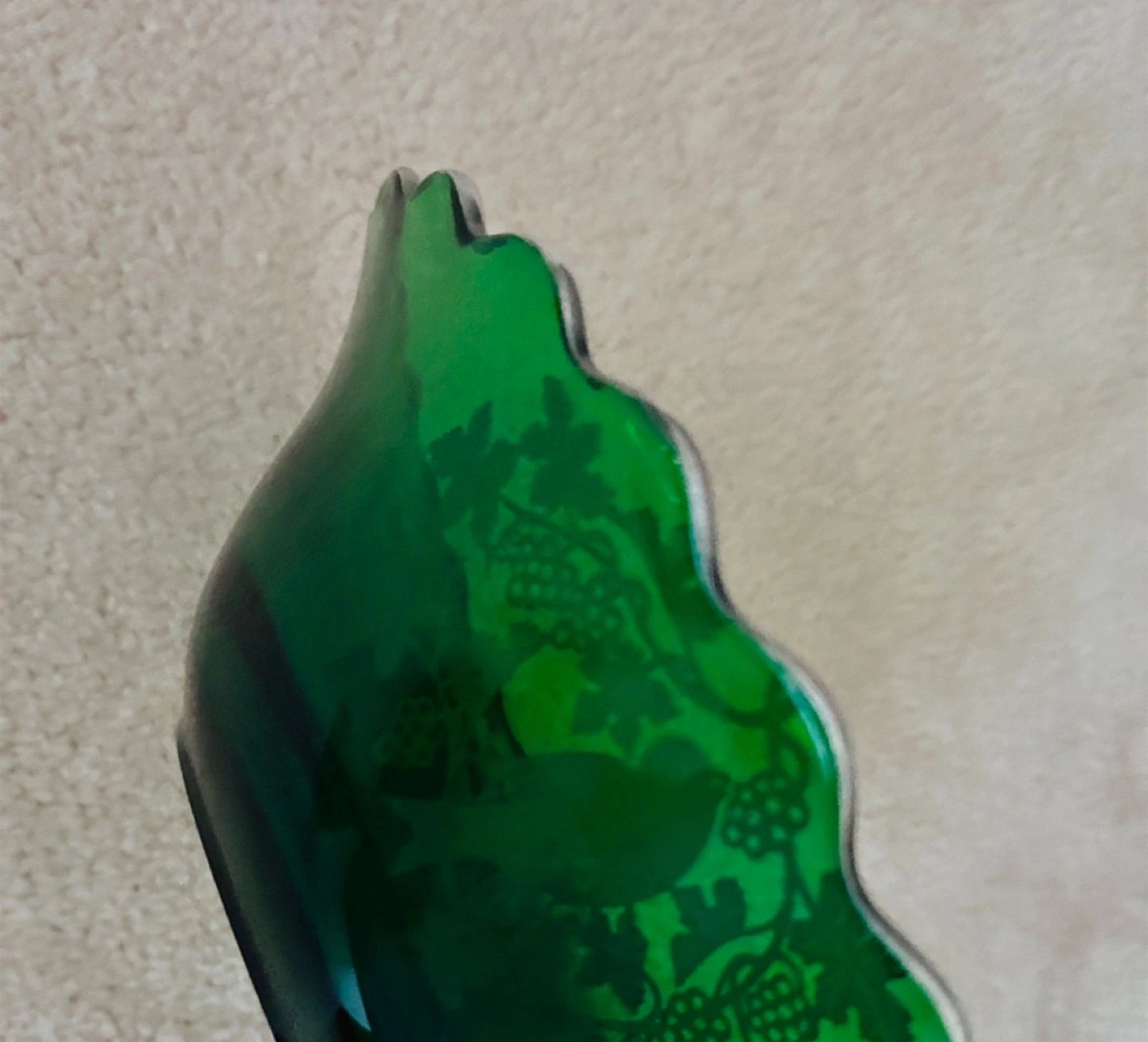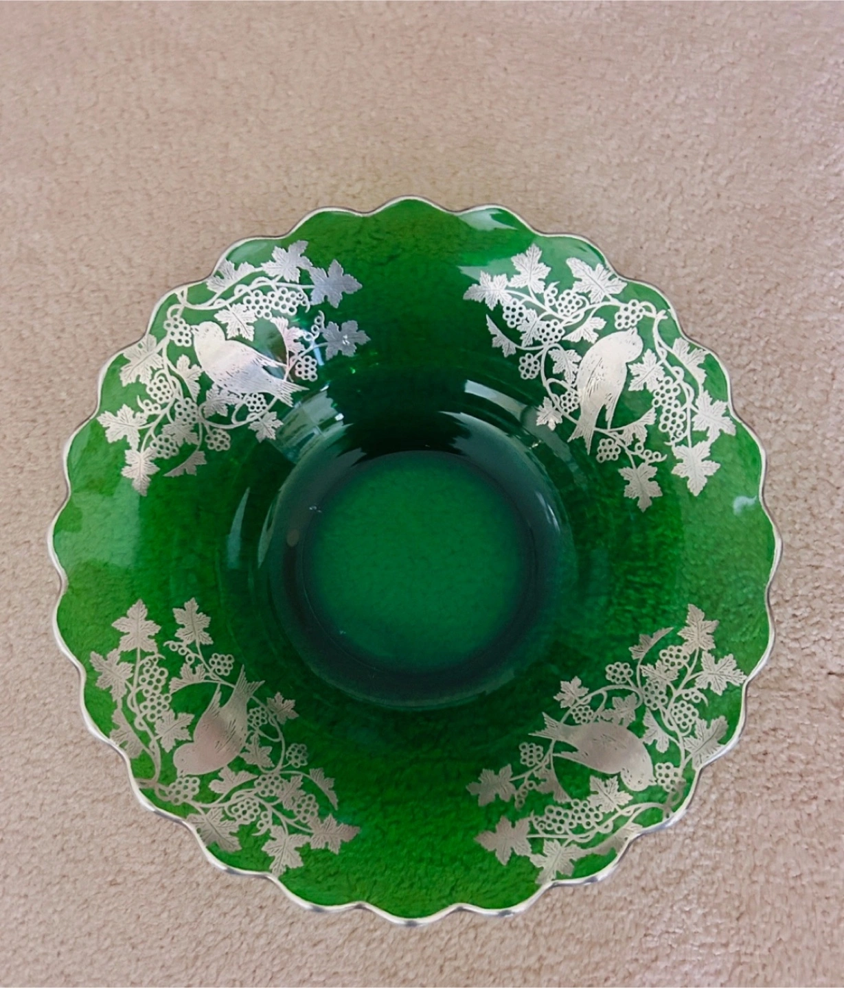 12 inches diameter Beautiful vintage Northwood emerald green glass bowl. Scalloped edges. Silver detailing features birds amongst grapevines. Unique piece for your home decor