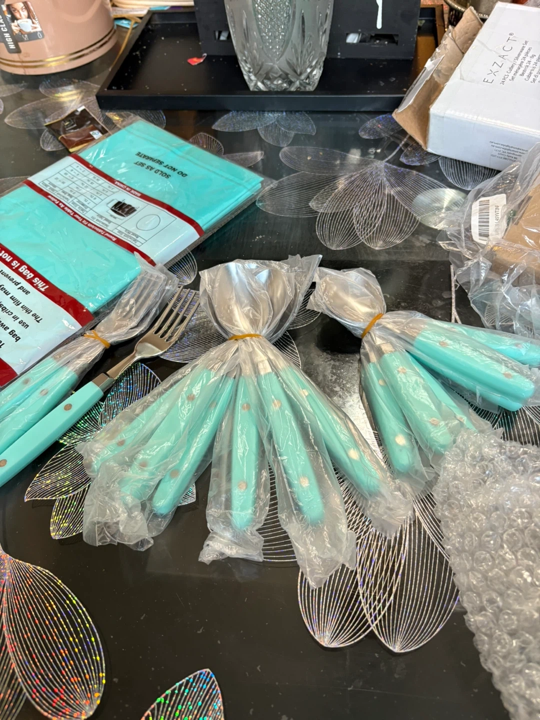 These are two packs of EXAC T plastic tablecovers. They're durable, waterproof, and washable. Each pack contains one tablecover measuring 84" x 213cm.