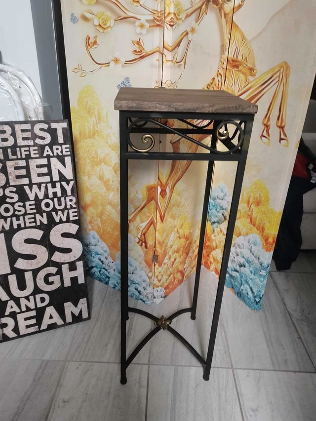 Rare find metal base stand for flower pot and display gold paint touch on the side and bottom top plank 12.5x12.5" height 36"