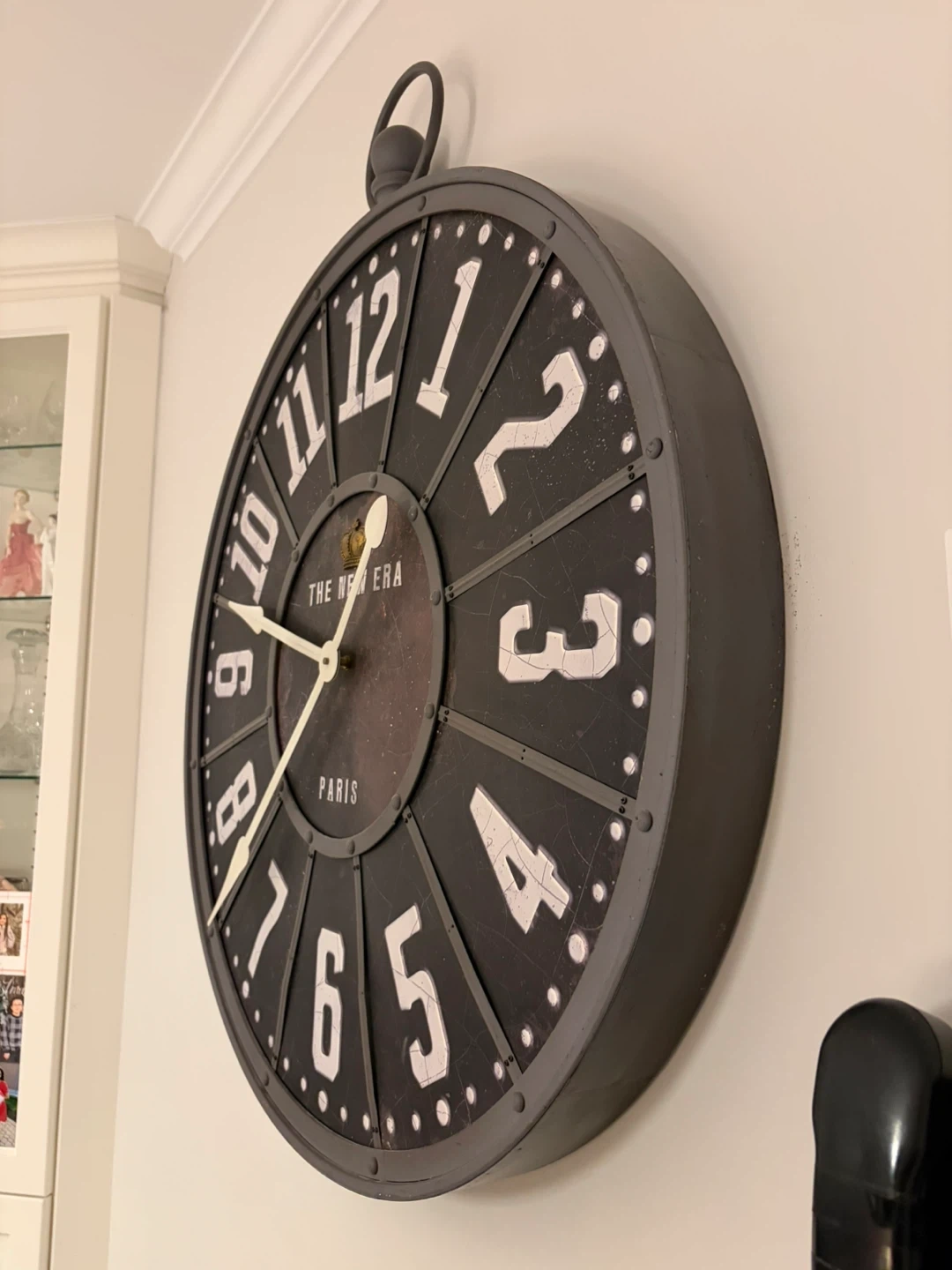 Stylish wall clock with large white numbers on a black distressed face. The clock displays 'The New Era Paris' in the centre. It's a decorative piece that's sure to add some character to any room!