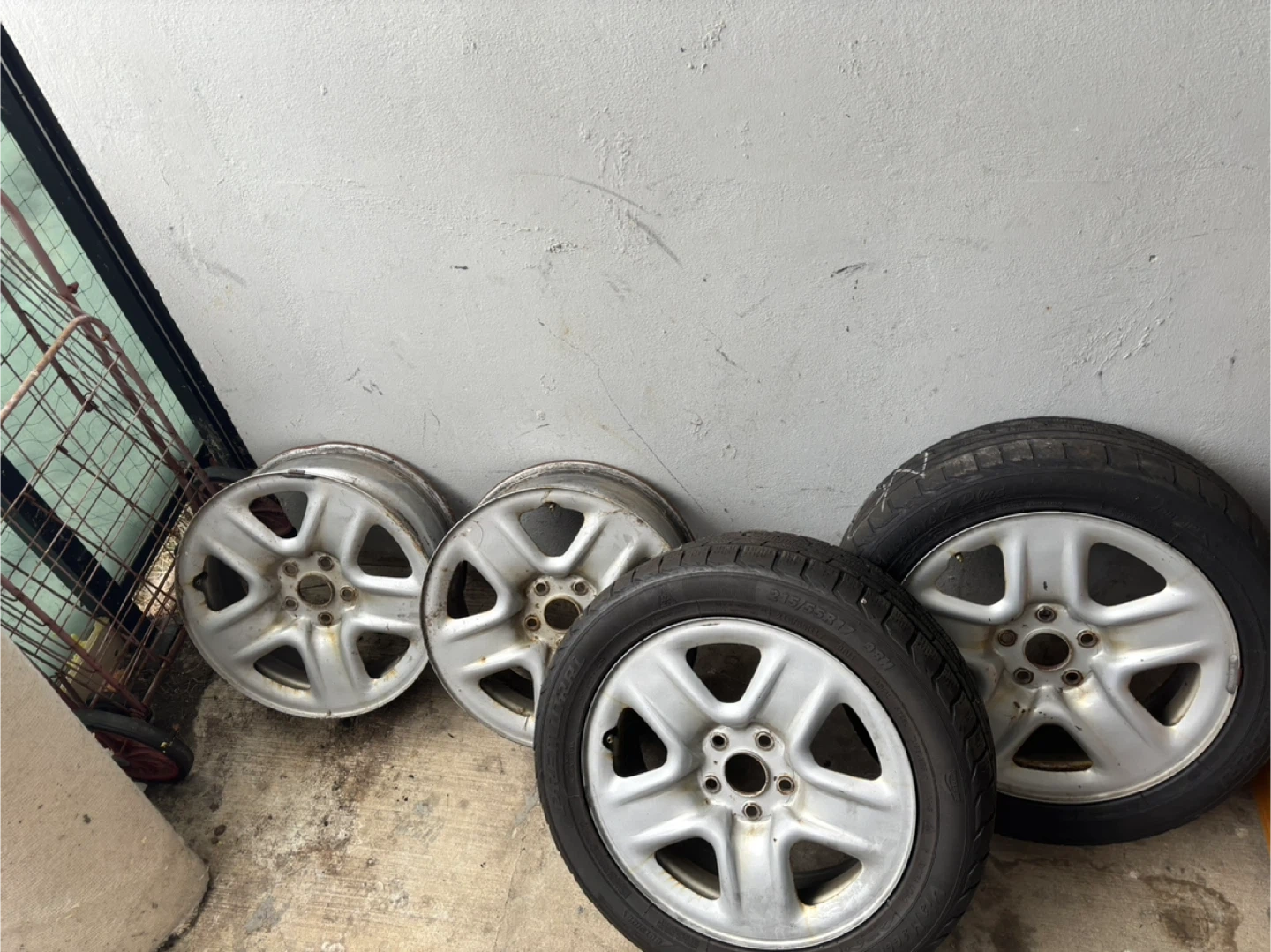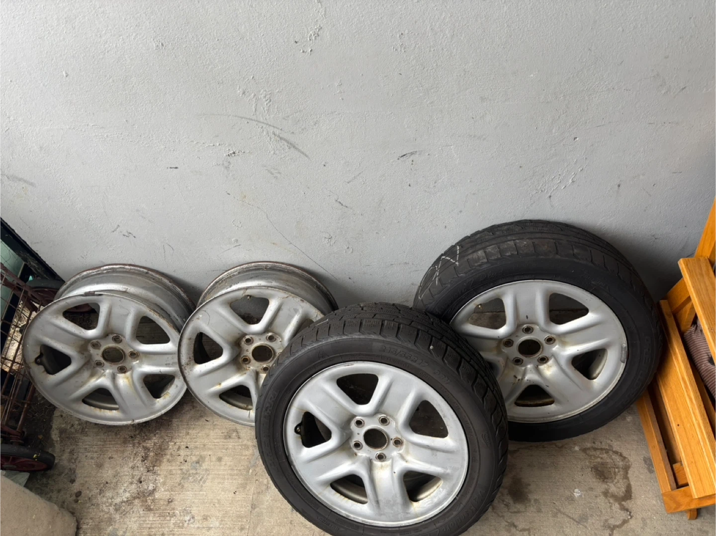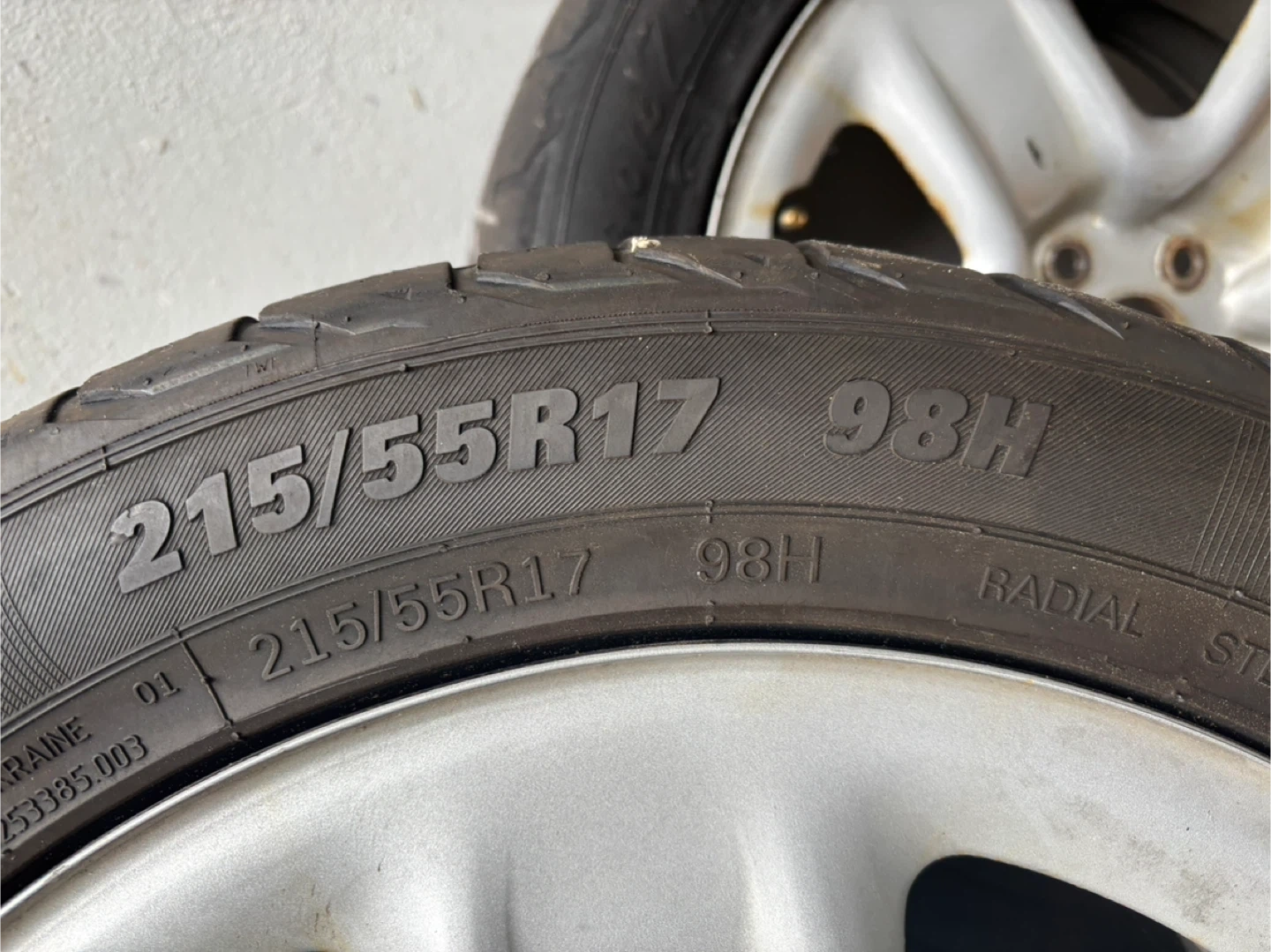 Set of four 215/55R17 tires mounted on rims. Tires are 98H rated. Rim size is 17 inches. Sidewall construction includes 2 Polyester + 2 Steel + 1 Nylon.
