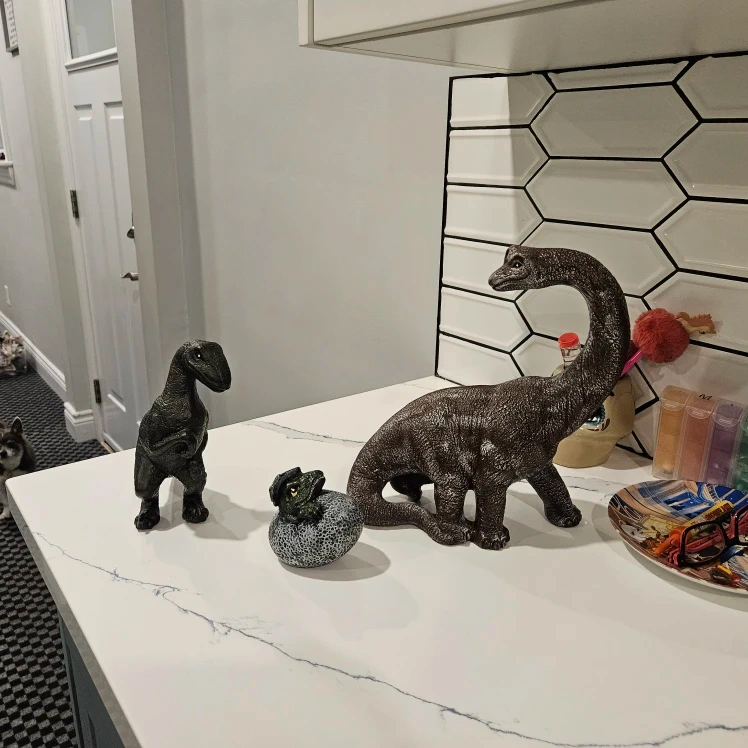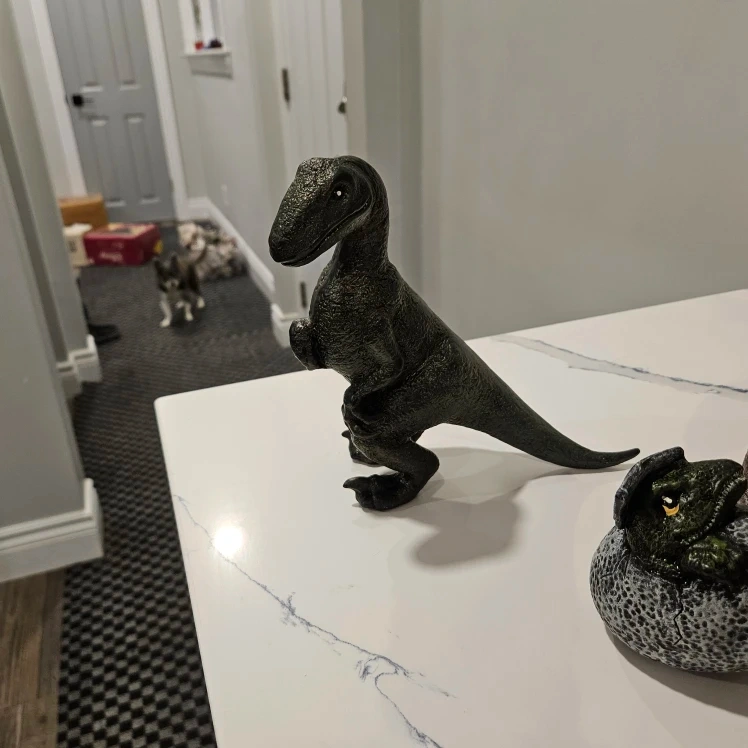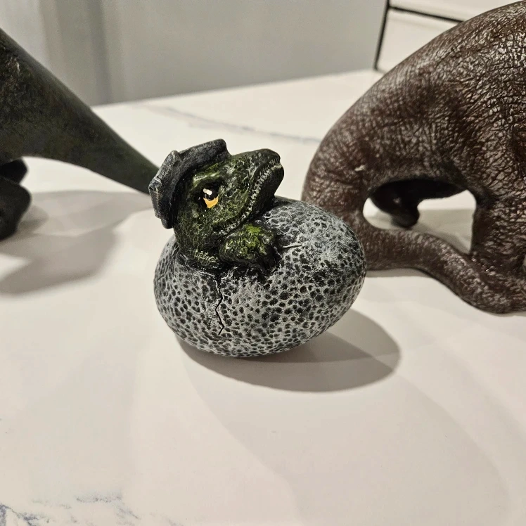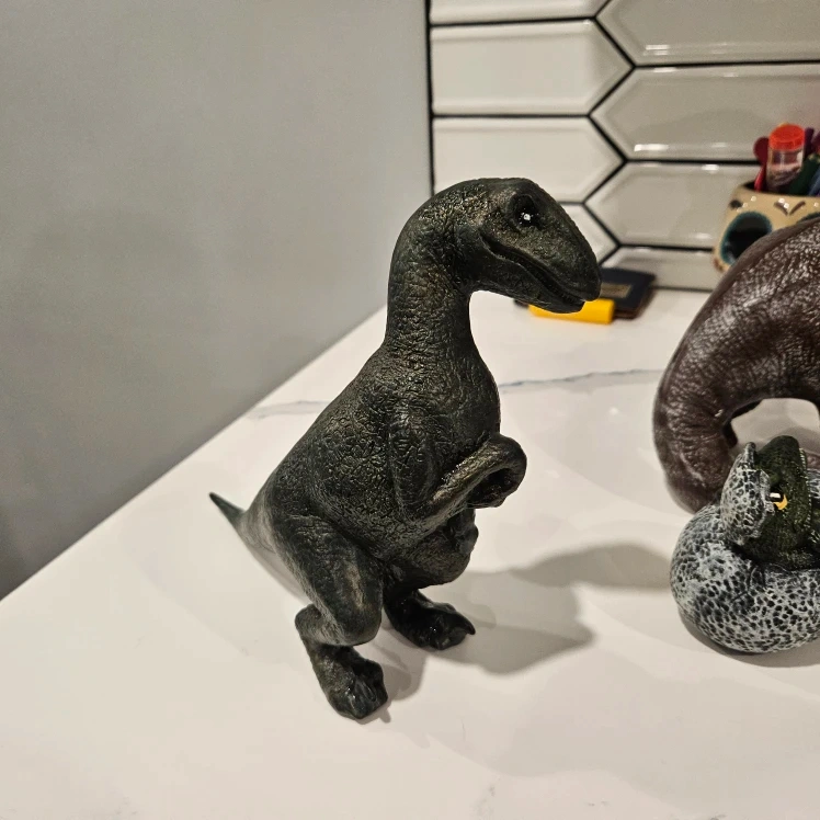 60Selling a set of three ceramic dinosaur figurines. Includes a Brachiosaurus, a Velociraptor, and a baby dinosaur hatching from an egg. They're in great shape and would look great on a shelf or desk!