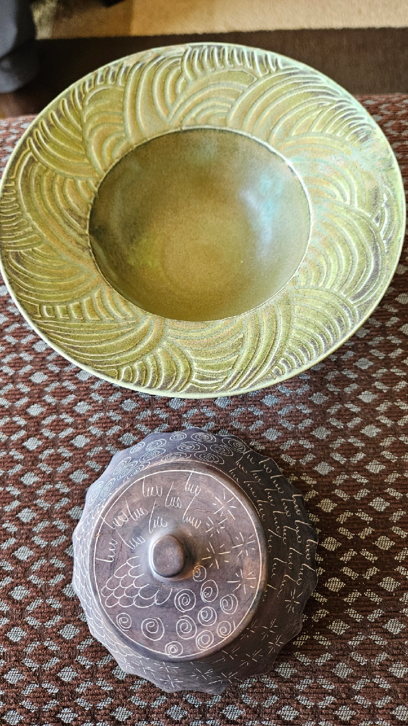 72Selling a unique ceramic bowl and lidded jar set. The bowl has a beautiful textured design, and the jar has intricate patterns. Both pieces are in good condition and would make a lovely addition to any home