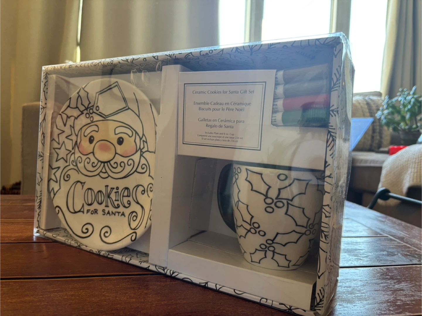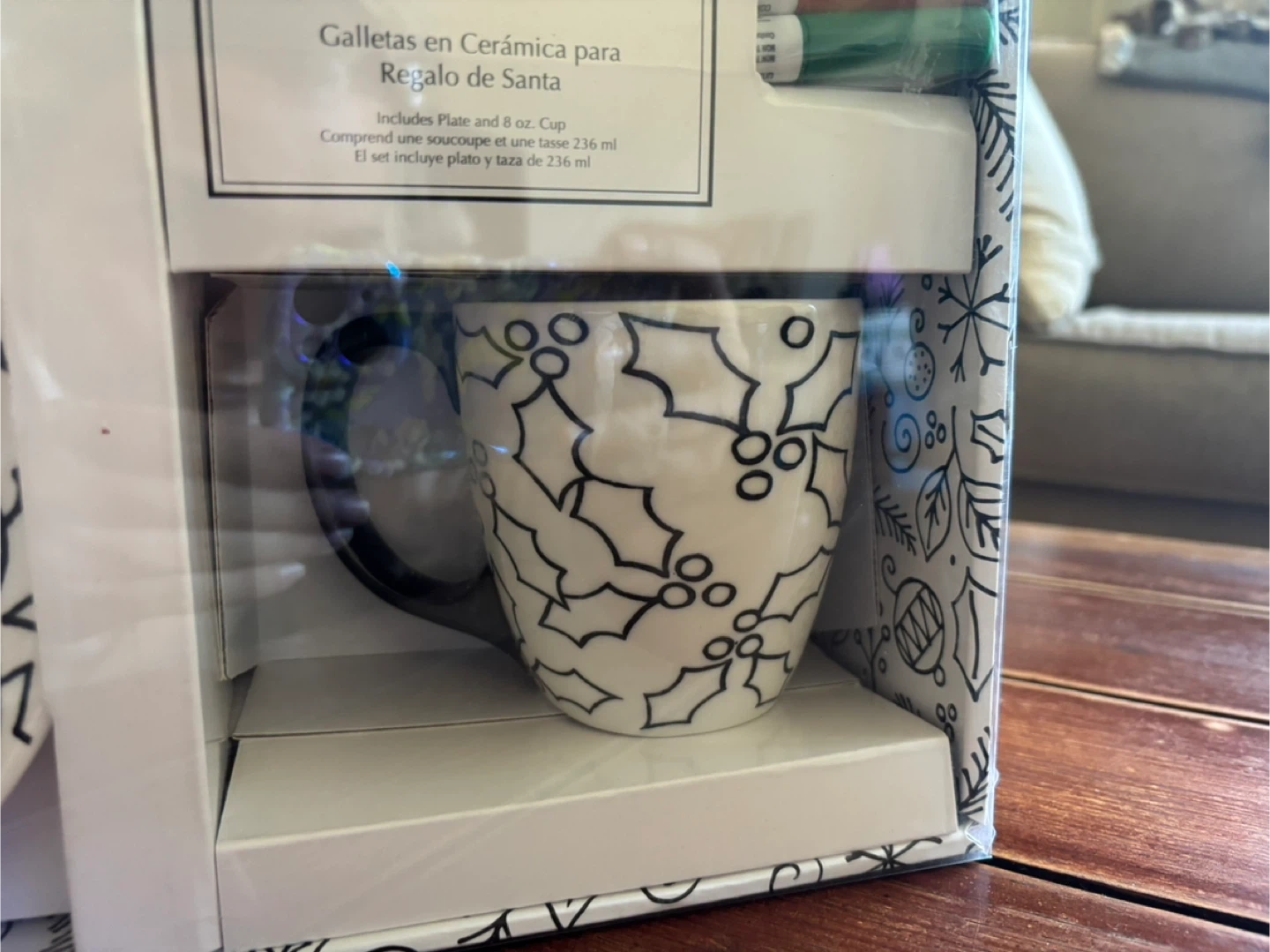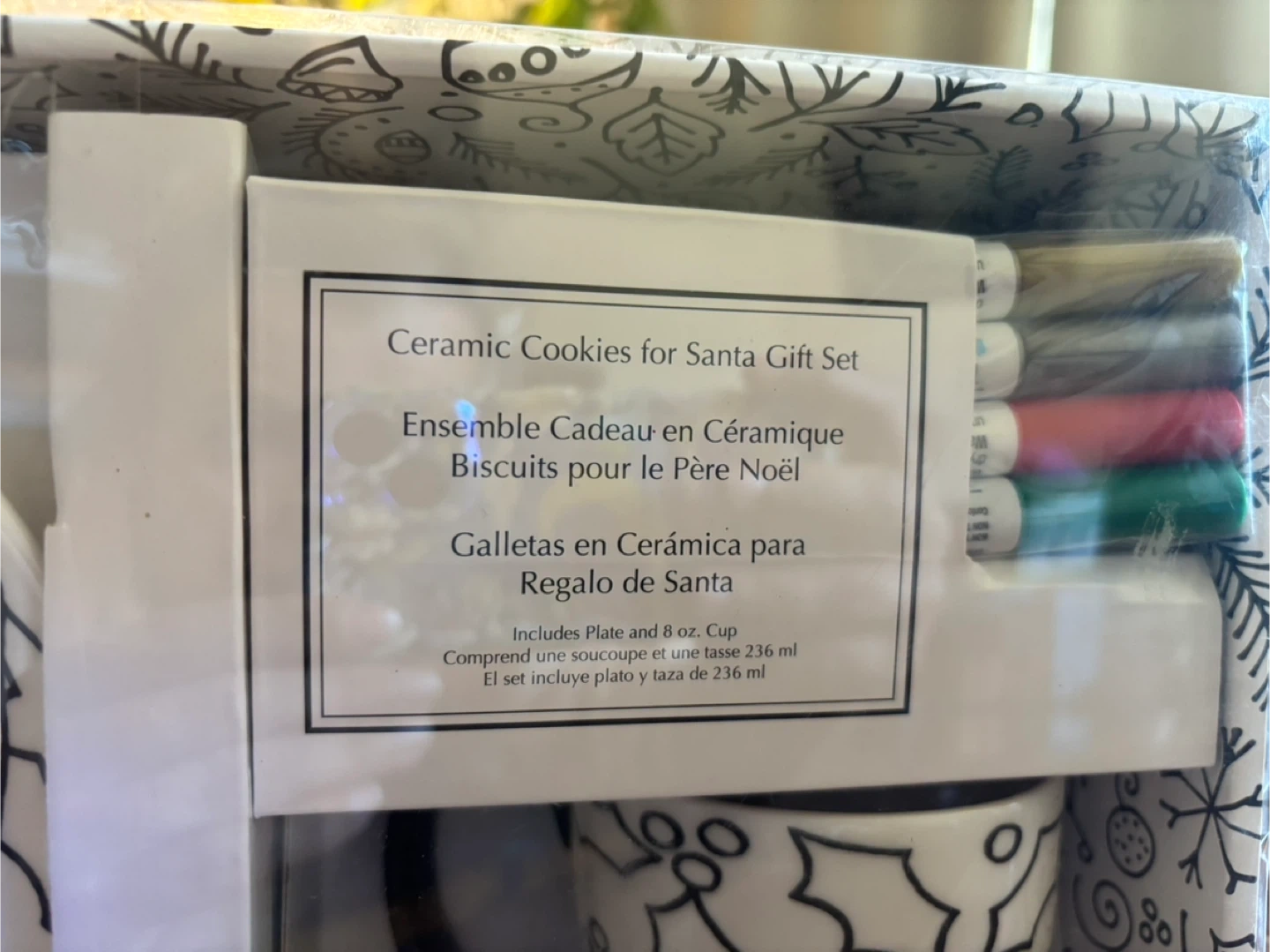 Brand new ceramic cookies for Santa gift set! Includes a plate and an 8 oz cup, ready for some festive fun. Perfect for getting into the holiday spirit. Includes 4 markers to paint the plate and mug or leave it as is. A great holiday activity for it the kids. Cash only.