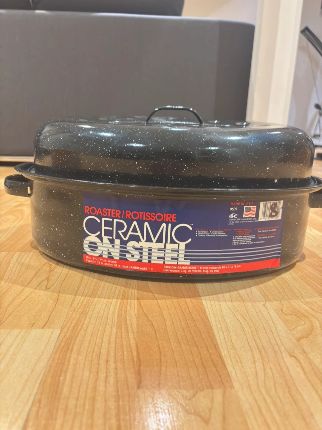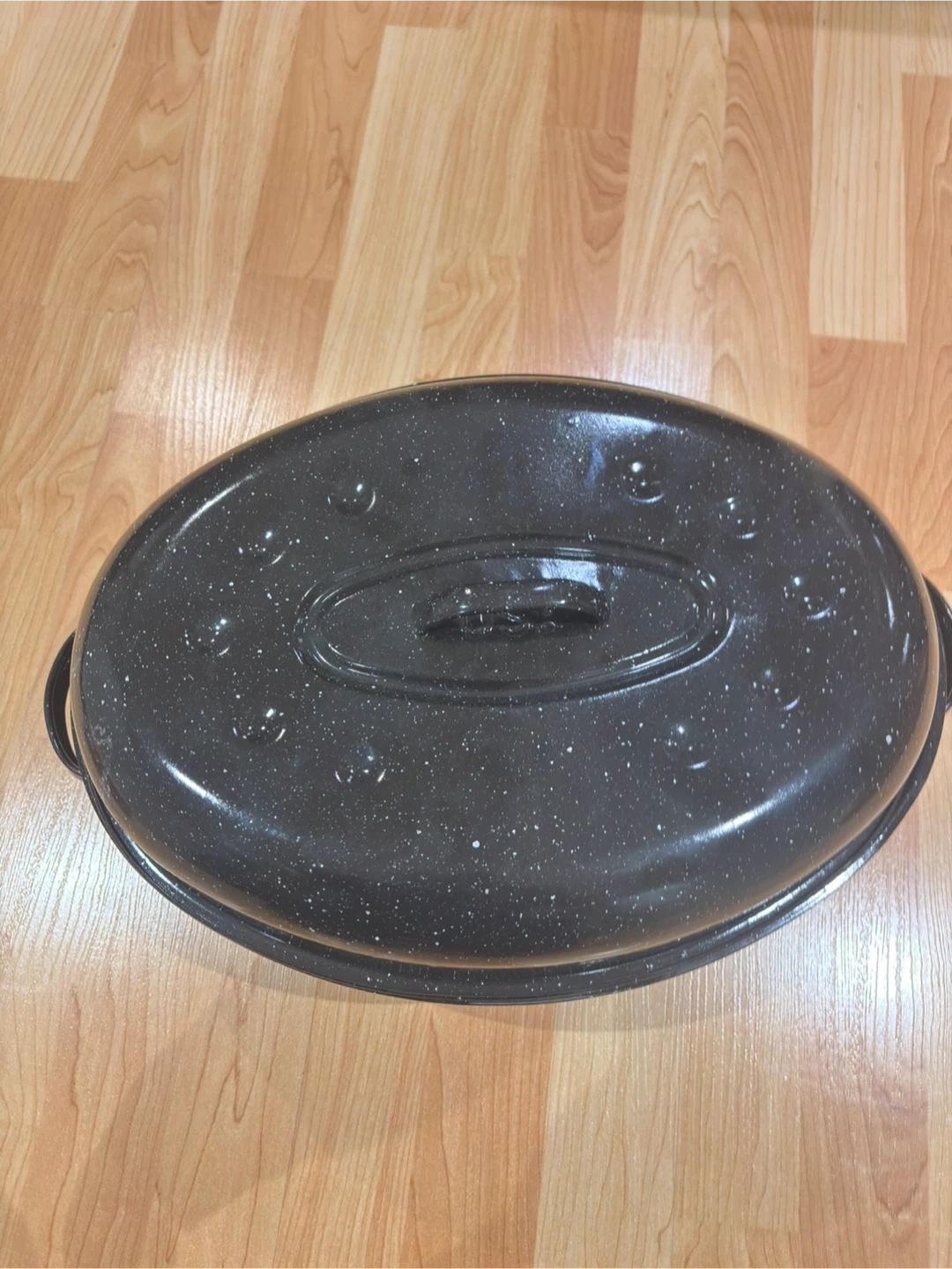 Ceramic on Steel roaster/rotisserie with lid. It's in great shape and ready for your next roast! The roaster is black with white speckles. It's a great size for a large family meal or holiday gathering
