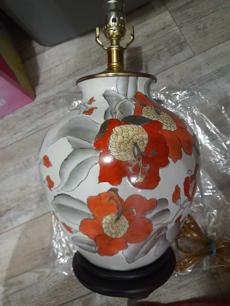 23White ceramic lamp with floral design. Brass accents. Includes cord and plug.